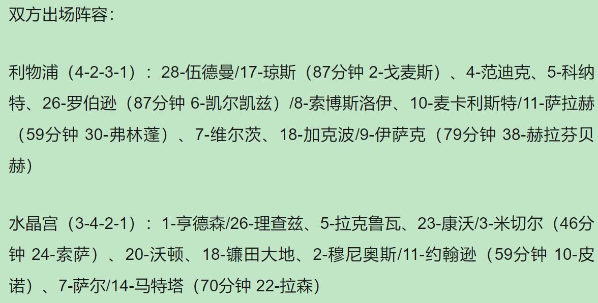 然后呢?然后萨拉赫伤了,索博斯洛伊隐身了,麦卡利斯特传球像扔飞盘——偏得离谱。水晶宫三后卫扎紧篱笆,格拉斯纳那战术板写得明白:我就耗你,等你急。马特塔头球被伍德曼扑了,拉森单刀中柱,水晶宫浪费机会的样子,跟利物浦上赛季简直一个模子刻的。