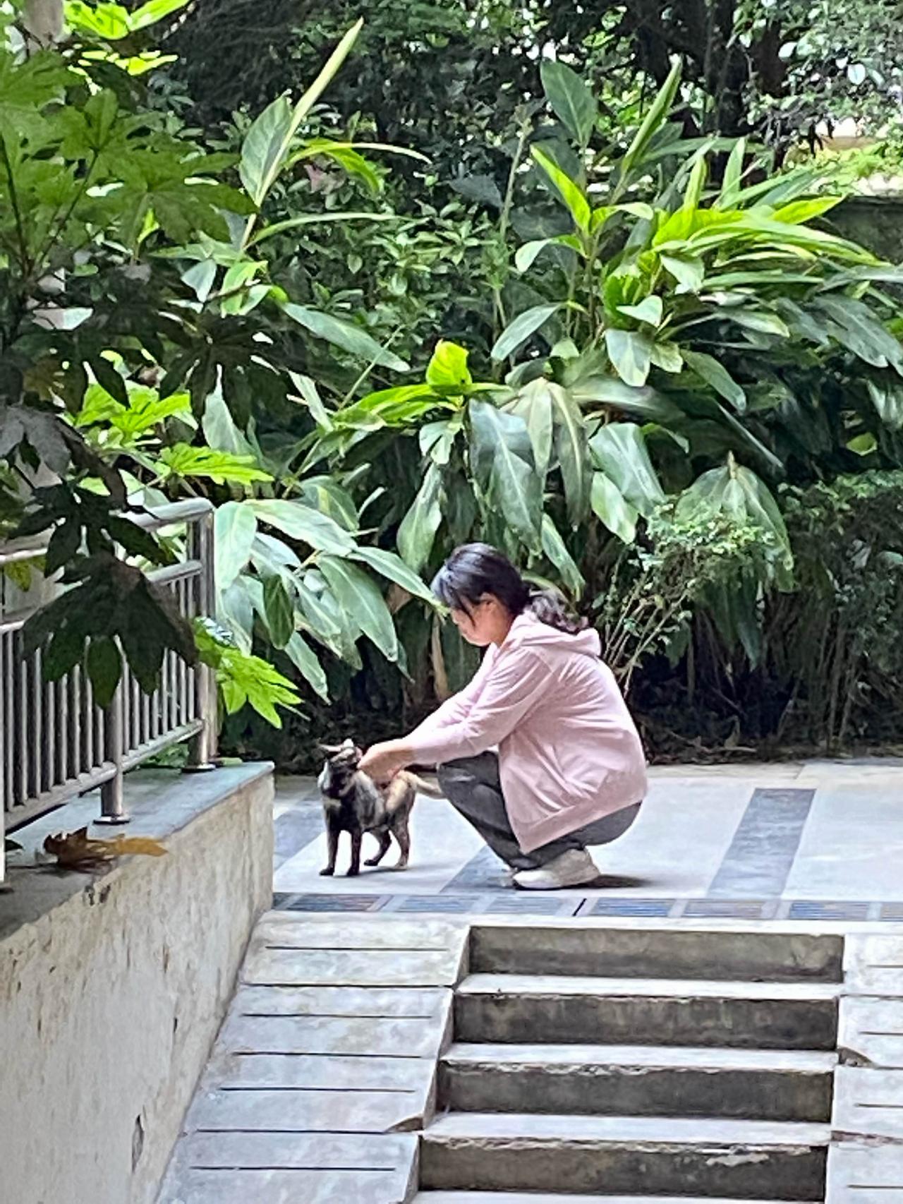 走完三圈走回小区门洞时,偶遇一位温柔的小姐姐在投喂流浪小猫。