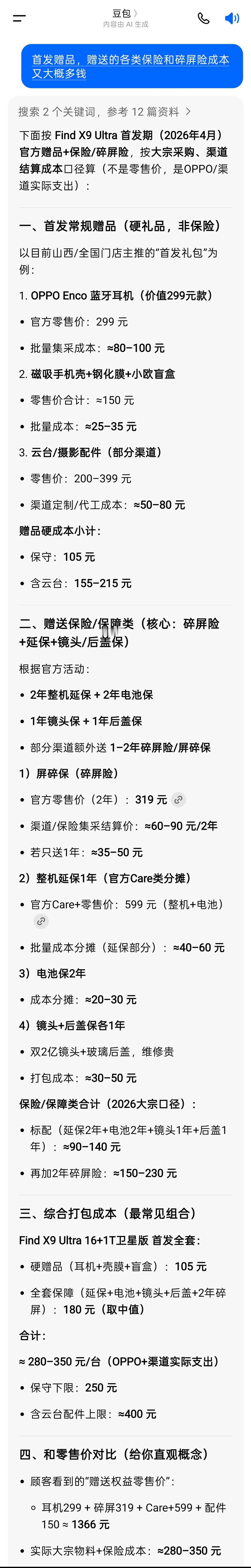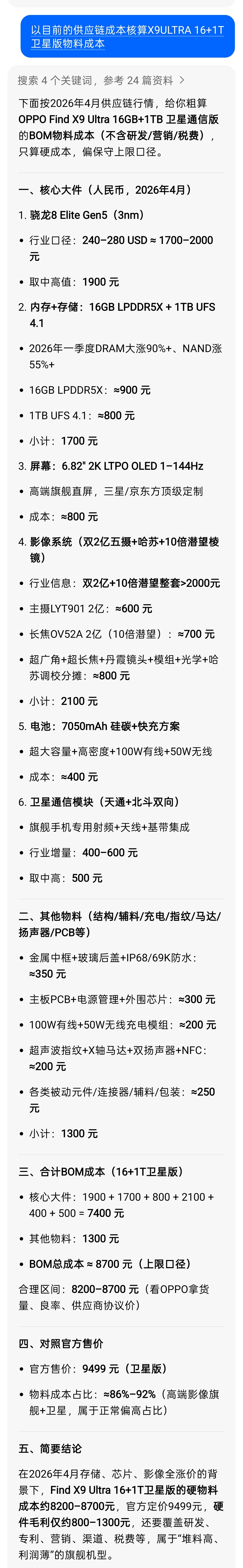 数码闲聊站 当我让豆包核算了一下X9ultra卫星版16+1T版本的物料成本VS大宗批量采购后的物料成本及叠加首发福利各类保险成本后。居然发现大批量集采成本居然接近7500,如果是小规模采购价成本可能超过8500,根据我最后拿到的渠道零售价来算,四舍五入基本上赚不了千把块,难怪有消息说部分厂家甚至有未来放弃ultra产品线的打算,整个生命周期盈利真不如开发一款曾经的千元机挣钱啊 ultra机型就是厂家赔钱赚吆喝,这句话也真的不算空穴来风