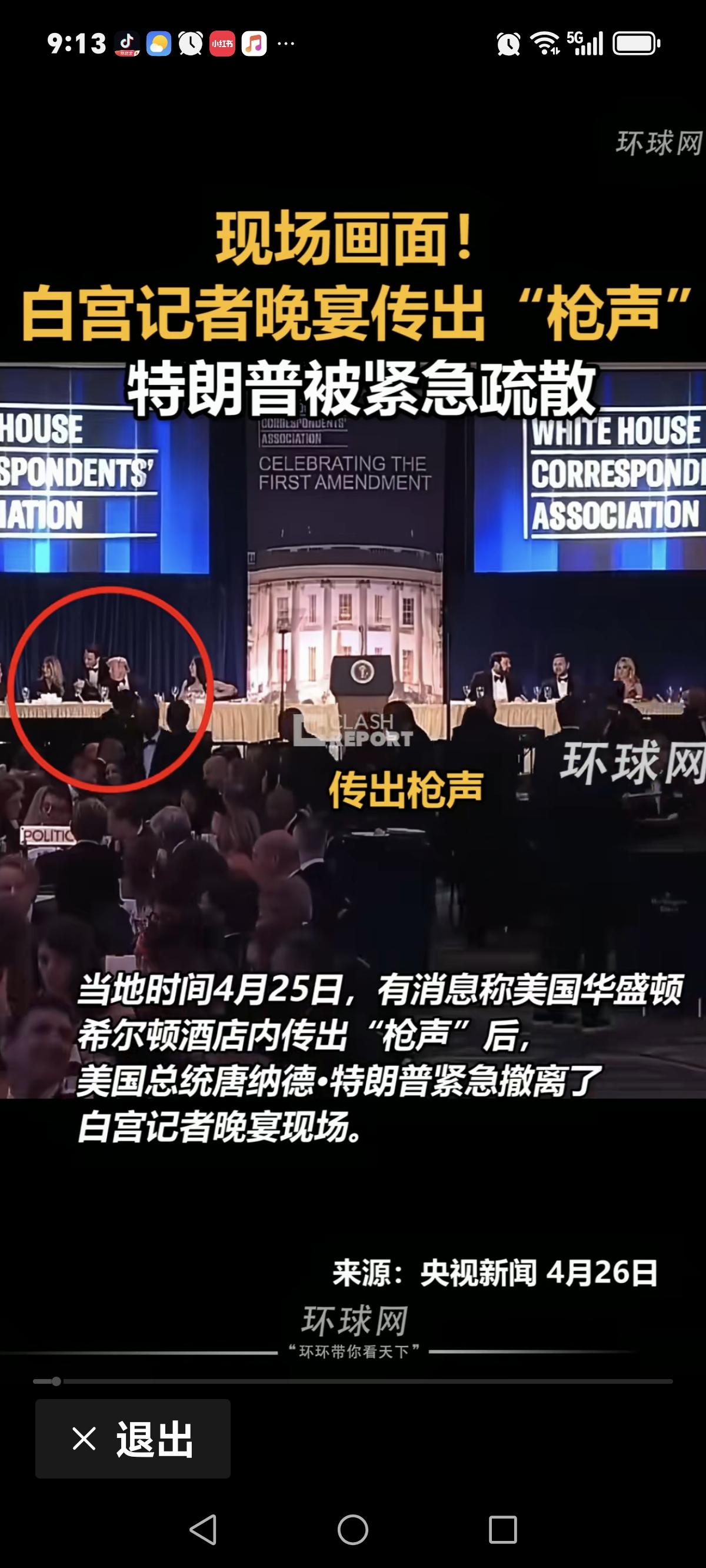 4月25日晚上特朗普又一次惊魂未定,当晚他在白宫参加记者招待会的晚宴上现场突然有枪声响起。