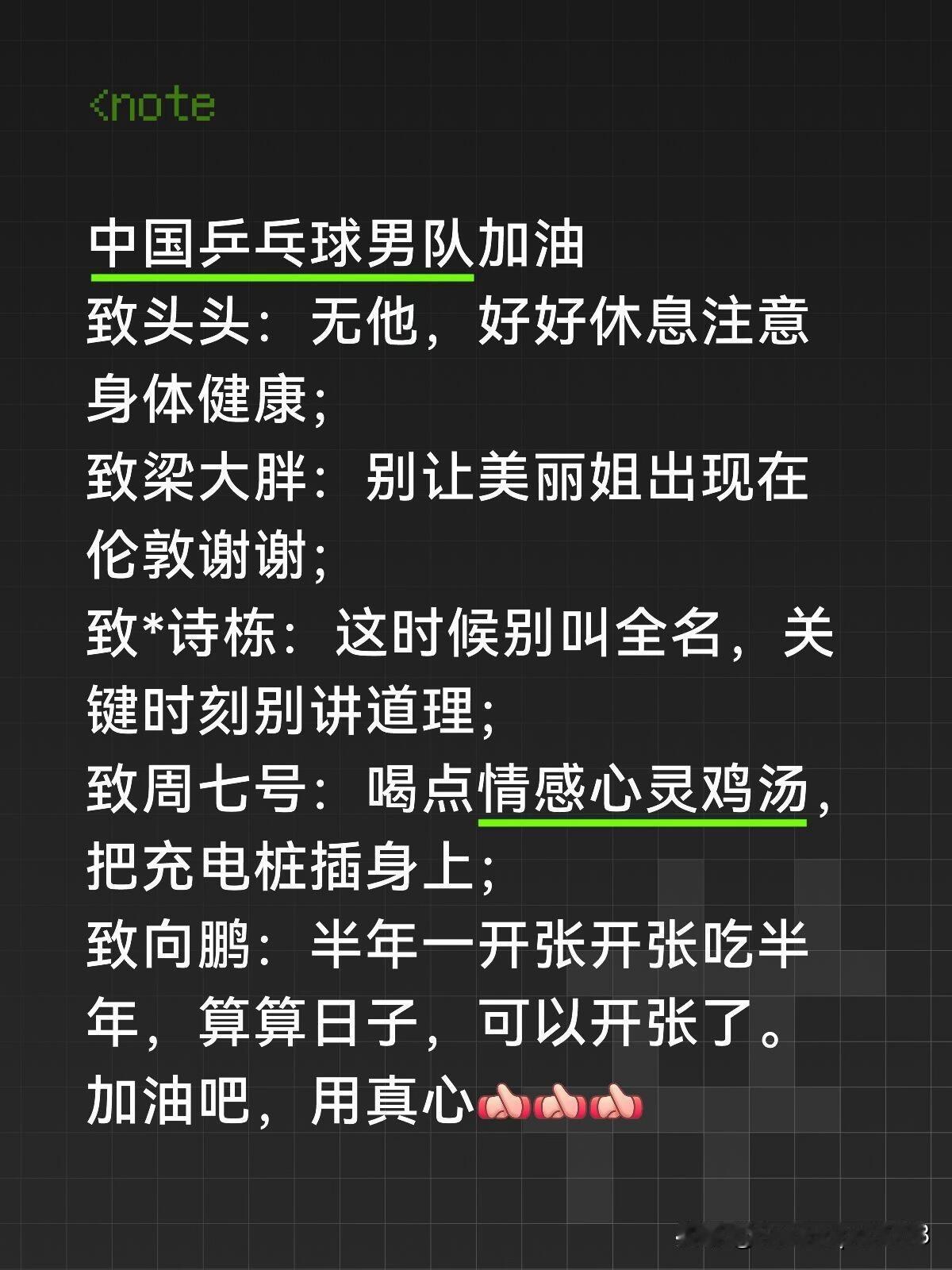 笑晕,网友对中国乒乓球队男队每个人的寄语,每一句都说在点子上了。 给头头的,啥