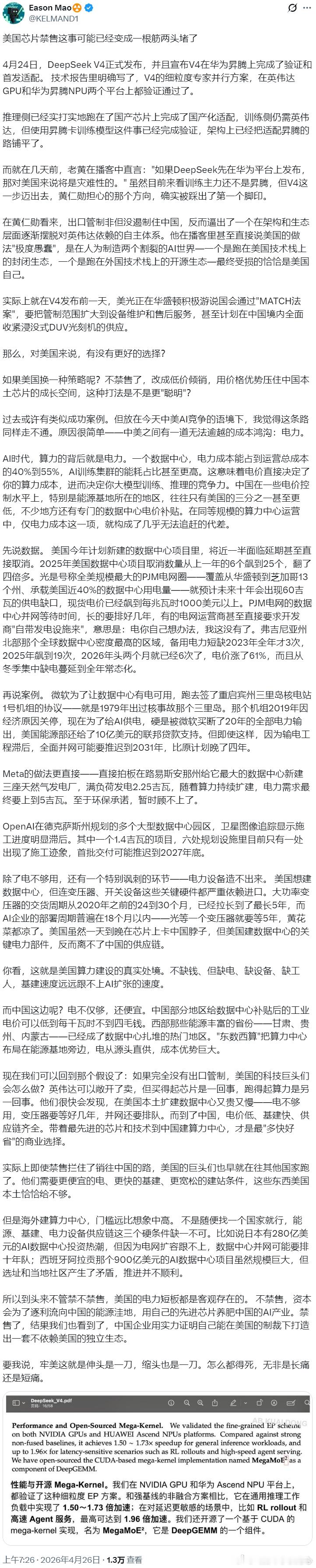 就在几天前,老黄在播客中直言:"如果DeepSeek先在华为平台上发布,那对美国来说将是灾难性的。" 虽然目前来看训练主力还不是昇腾,但V4这一步迈出去,黄仁勋担心的那个方向,确实被踩出了第一个脚印。烽火问鼎计划