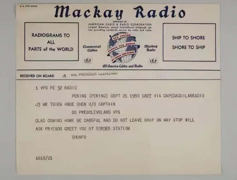 邮轮航行到太平洋上,1955年9月21日,船上的电报员送来一封给钱学森的电报,电报内容很短,写着“知你回国,甚慰,望小心保重,沿途勿登岸”,落款是钱学森的父亲钱均夫。
