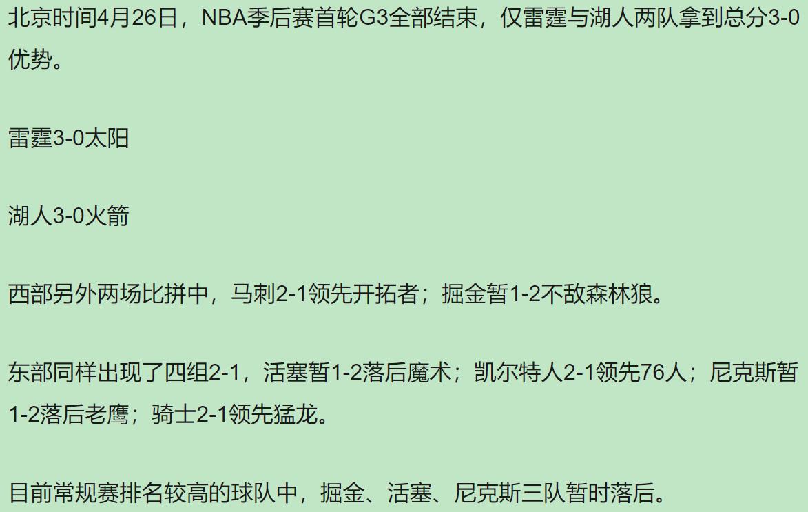 品出味儿没?季后赛不玩常规赛那套算术。球星成色、阵容深度、那股子"老子就是比你硬"的狠劲,才是真门票。排名?入场券而已。Game 5见真章,我瓜子备好了,看谁先扛不住。季后赛首轮G3:仅雷霆湖人2队3-0 掘金活塞尼克斯落后