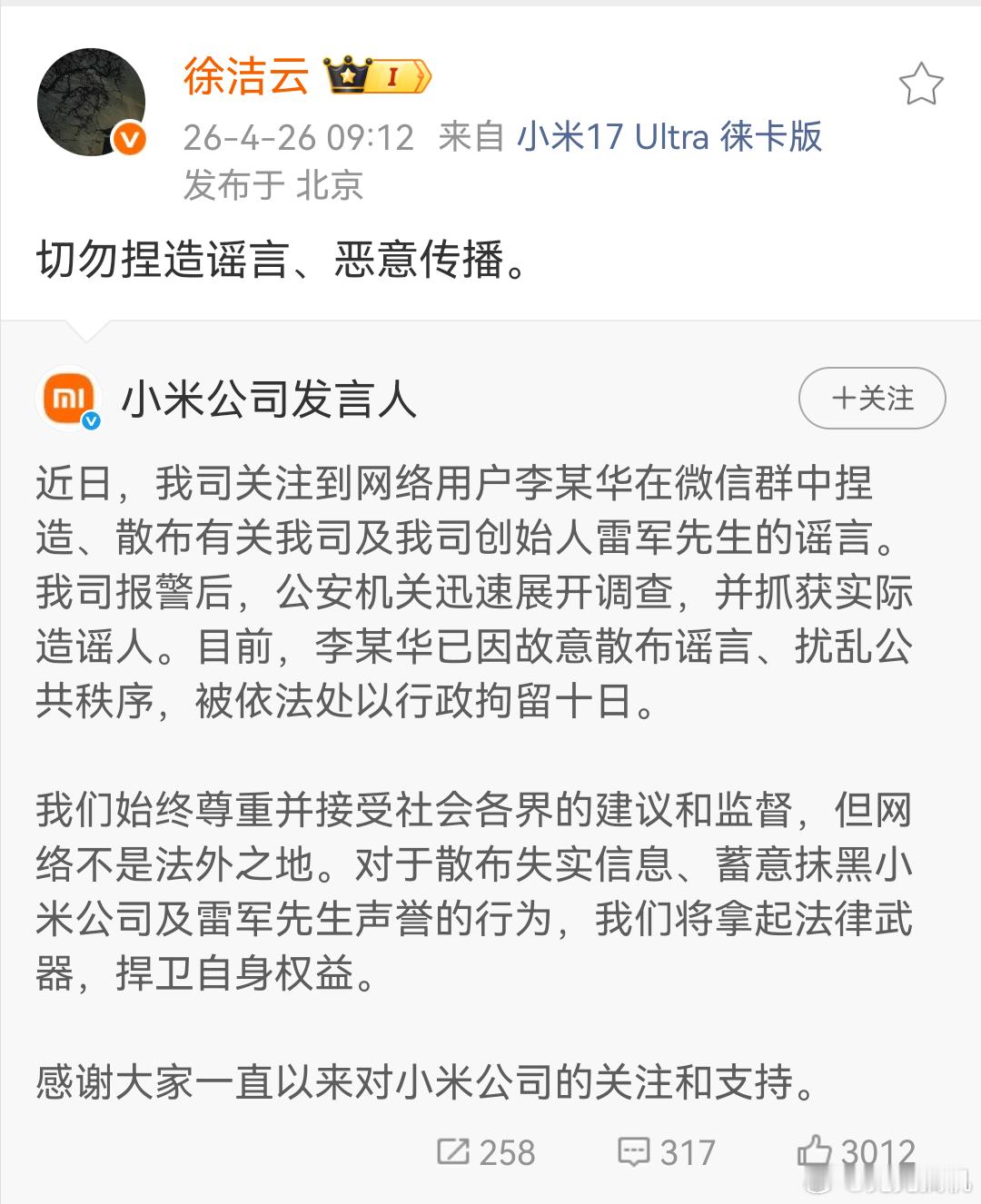 网民造谣雷军被行政拘留10天这次小米速度够快,前段雷总十五小时直播本就是服务区被