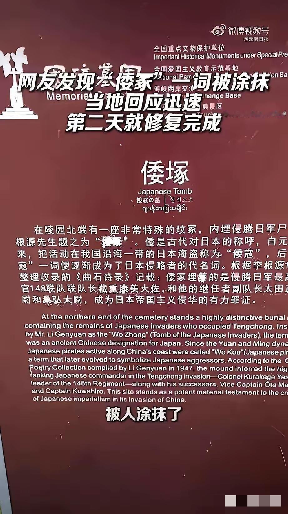 谁能想到,庄严的腾冲国殇墓园里,承载民族记忆的倭冢石碑,竟遭到人为破坏,碑上的倭字被恶意凿除,留下刺眼的破损痕迹。事发之后当地文旅迅速完成修复,字迹重新复原,可这件事带来的刺痛感,根本没法轻易抹去。