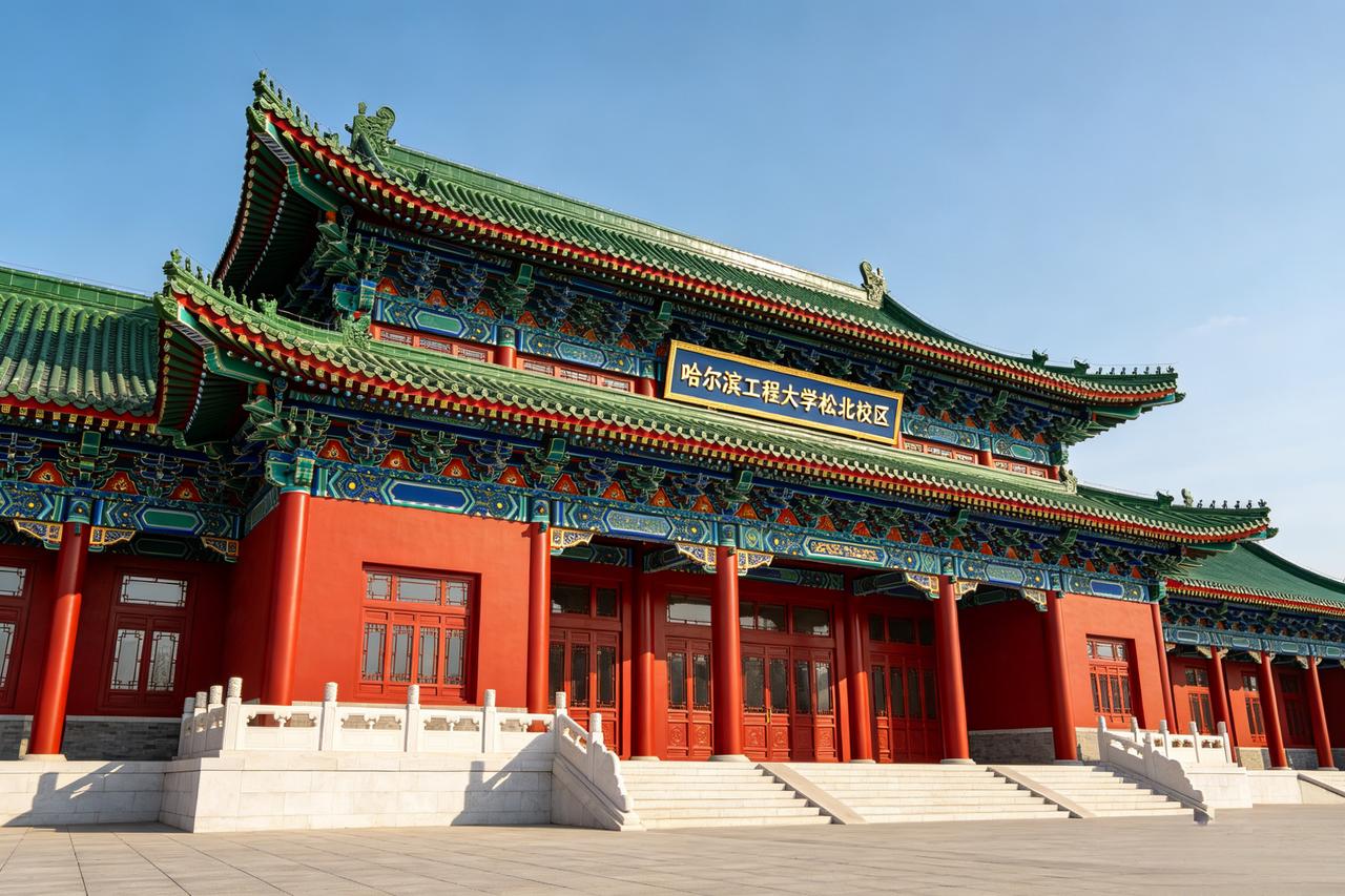 风格溯源:延续哈军工文脉,参考校内文庙清式形制,以《清式营造则例》为依据,主打飞檐翘角、斗拱彩绘、古朴庄重。