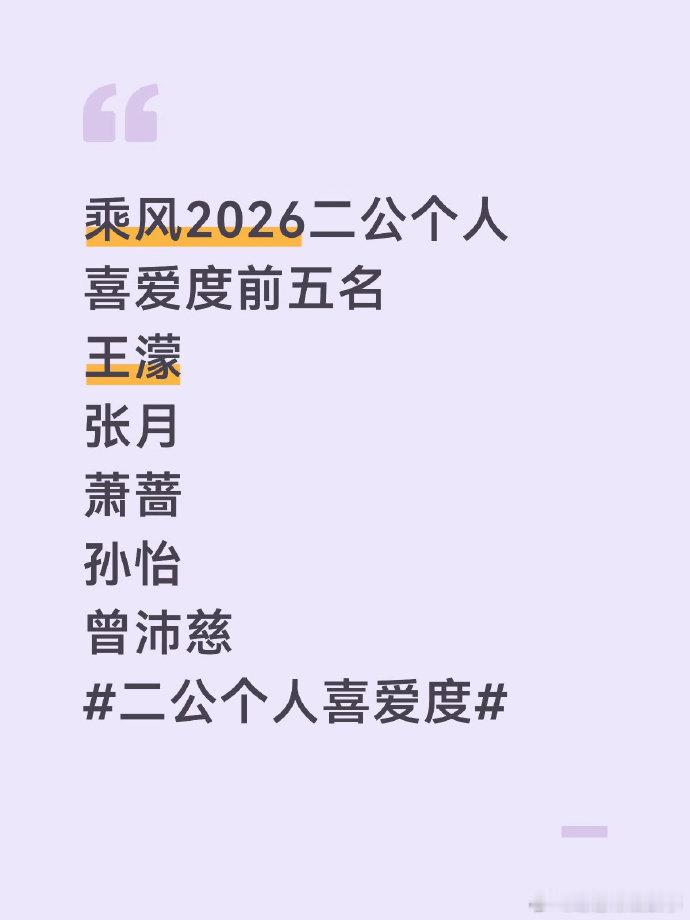 网传浪姐二公个喜排名网传乘风2026二公个人喜爱度新鲜出炉,王濛稳居第一,张月、萧蔷、孙怡、曾沛慈依次上榜,每位姐姐都凭实力圈粉!乘风2026