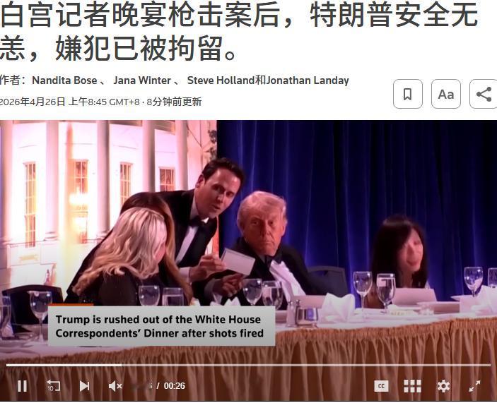 具体情况是:白宫记者协会晚宴现场传出枪声,一名携带武器的男子试图突破安检,被特勤局当场控制,一名特工中弹但因防护装备未受致命伤,特朗普随即被紧急撤离。