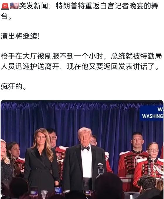 枪手已被拘留,特朗普被护送离开记者晚宴不到一小时,又准备重新登台讲话。