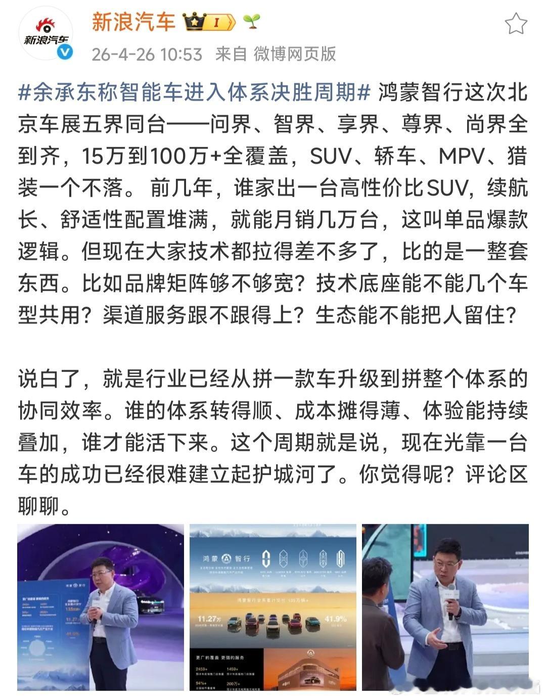 余承东称智能车进入体系决胜周期所谓“技术底座几个车型体系公用”,是有代价的。