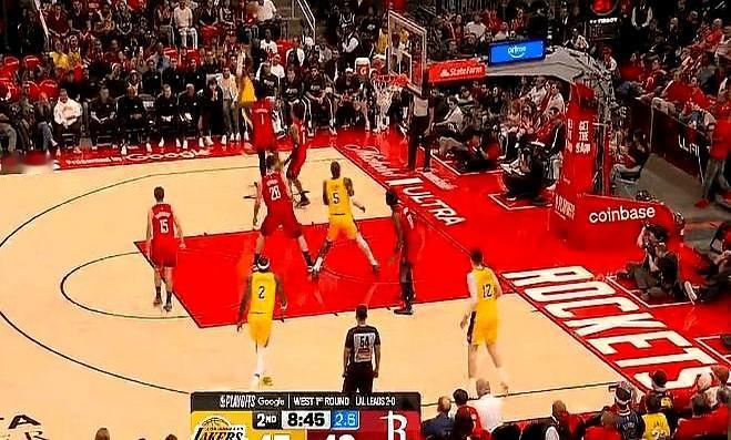 詹姆斯在第一节就被阿门·汤普森贴脸防死,根本没空间。结果他硬是在空中拧着身子把球扔了进去,太离谱了。