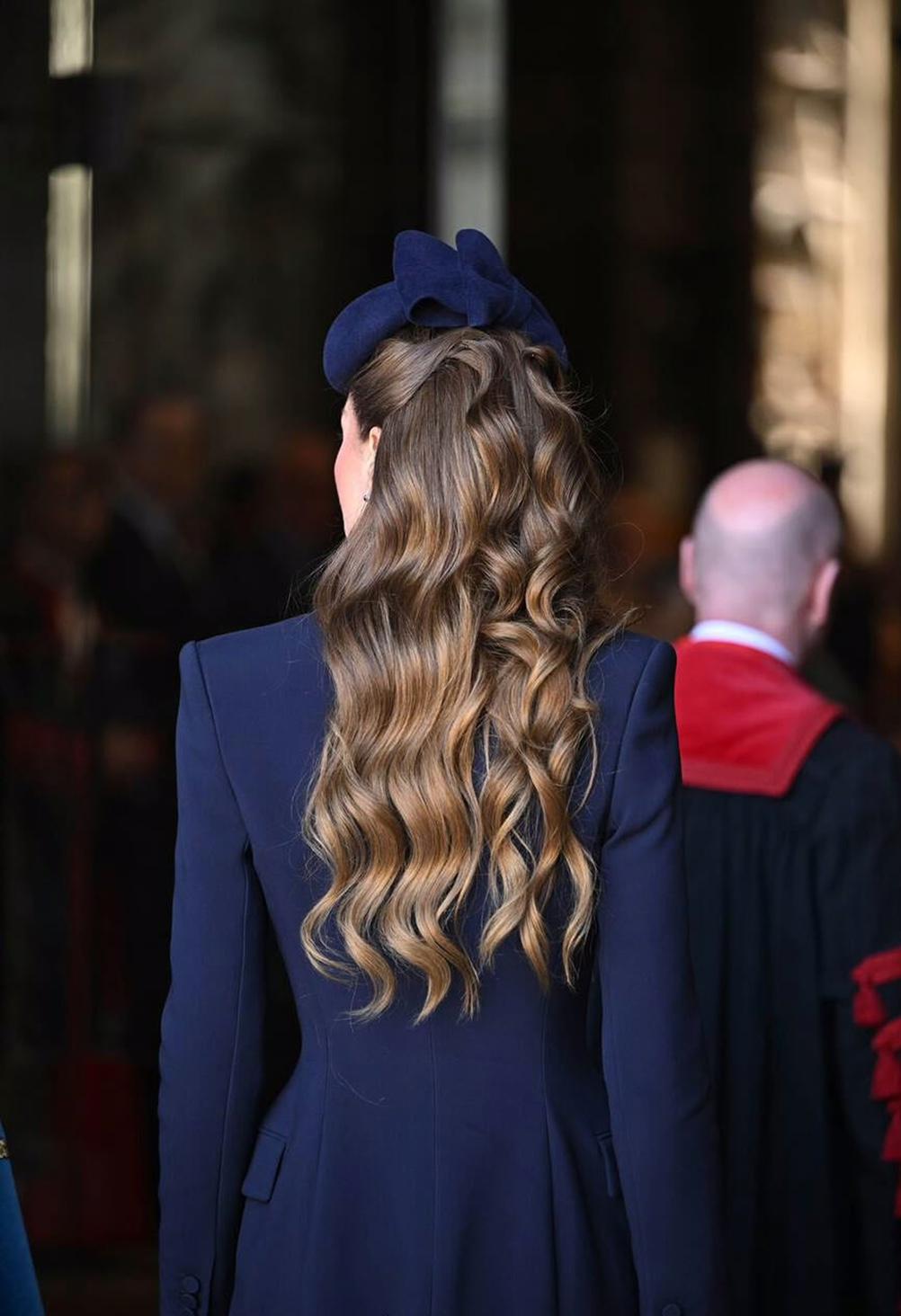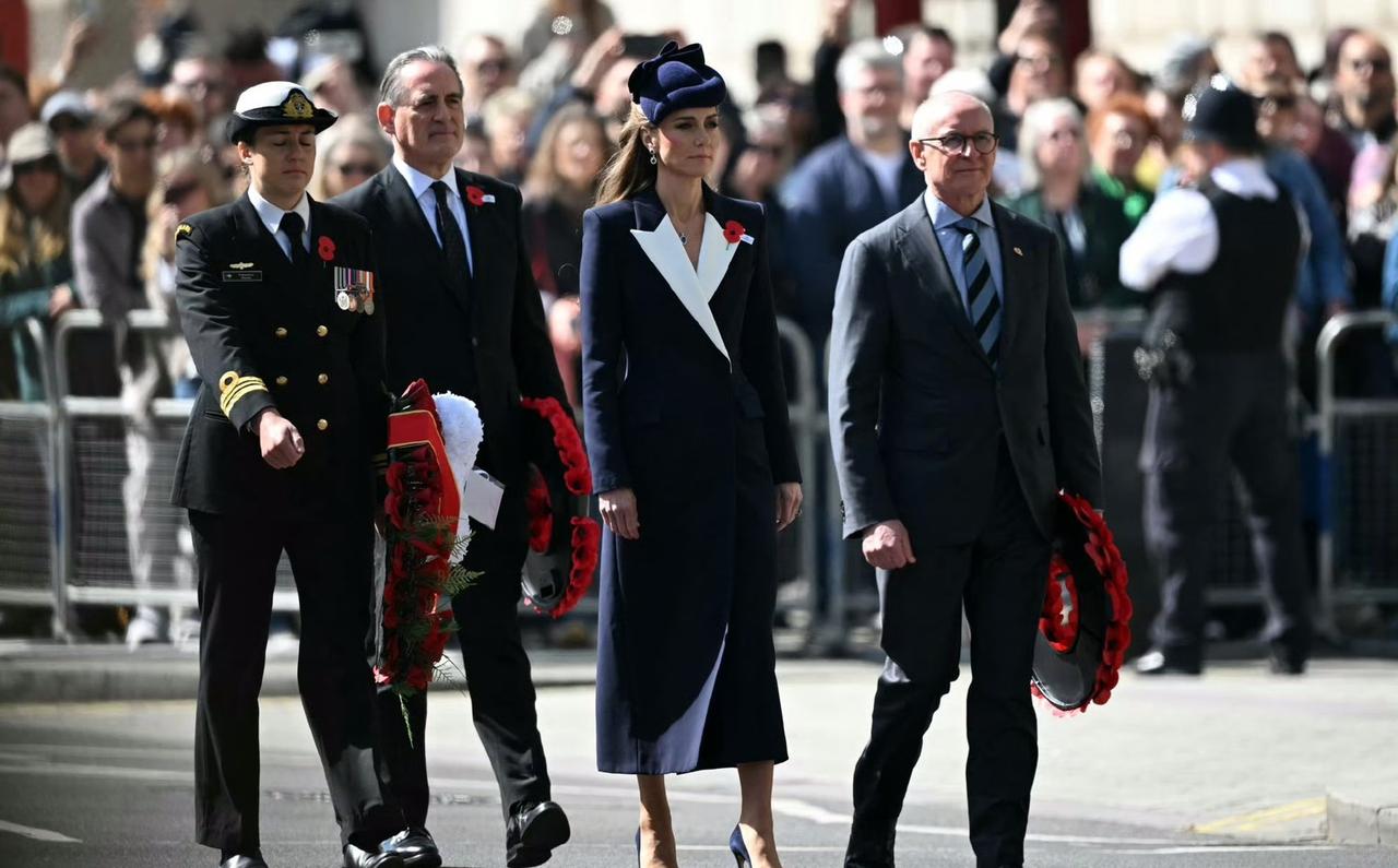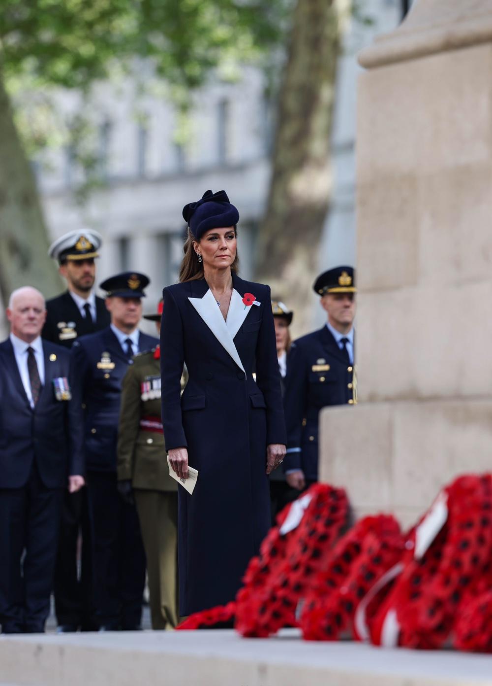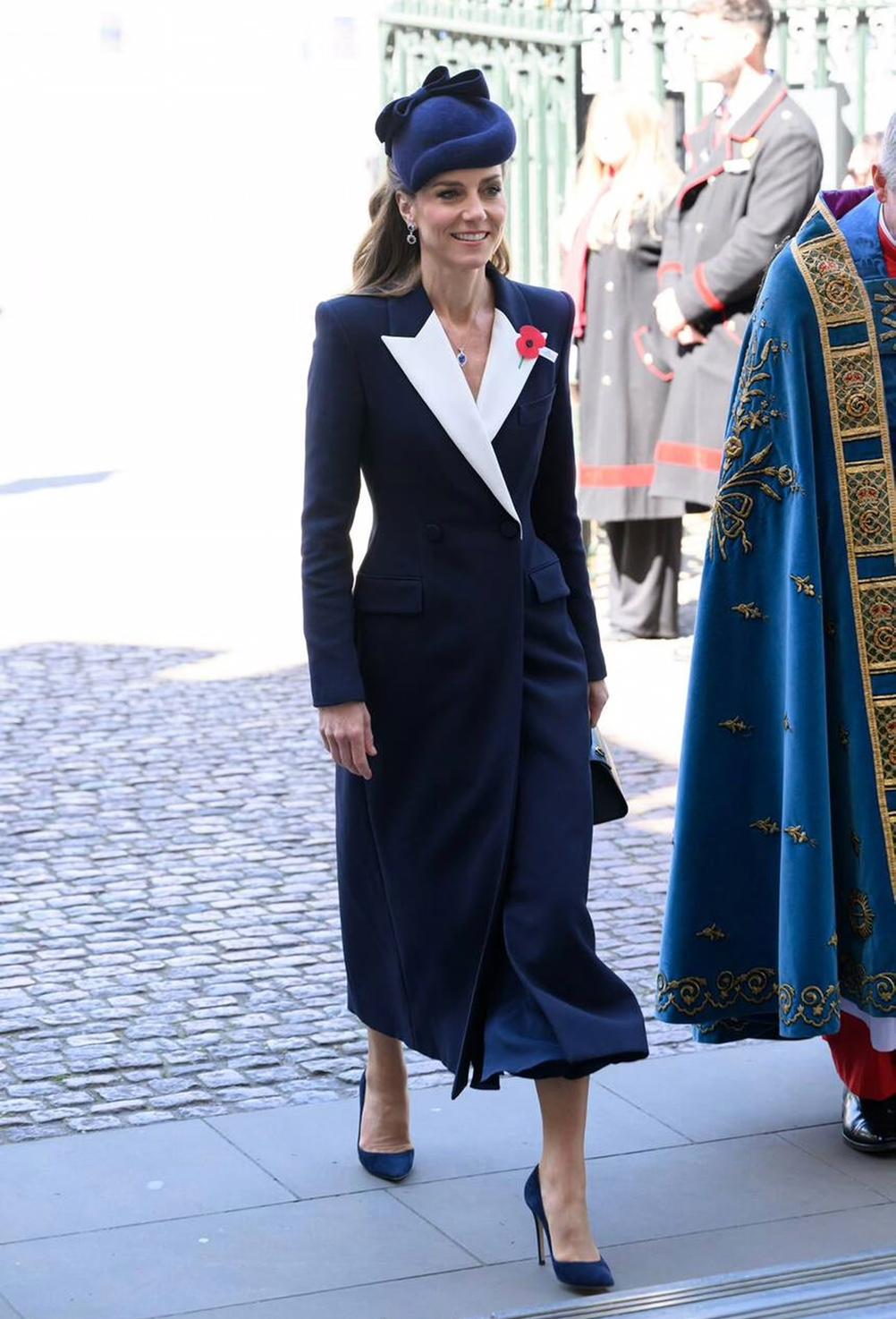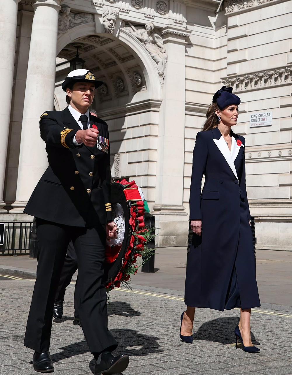 凯特王妃身着一袭蓝色麦昆修身礼服,搭配同色系礼帽,出席英国军队纪念活动。她代表查尔斯三世向阵亡将士敬献花圈,并在西敏寺大教堂主持追思会。 在正式场合中,王妃以蓝色与白色撞色的服装搭配亮相,沉稳庄重。修身的设计简约而高雅。
