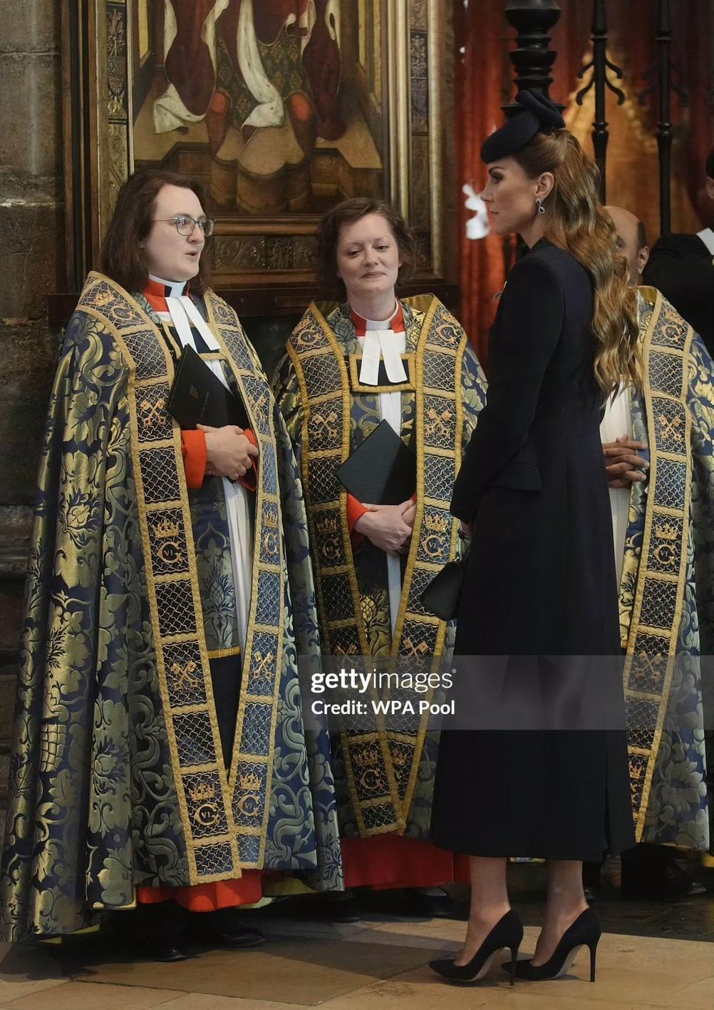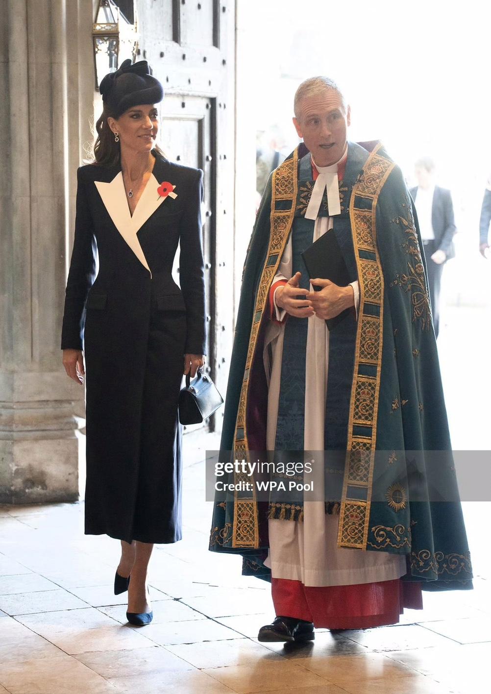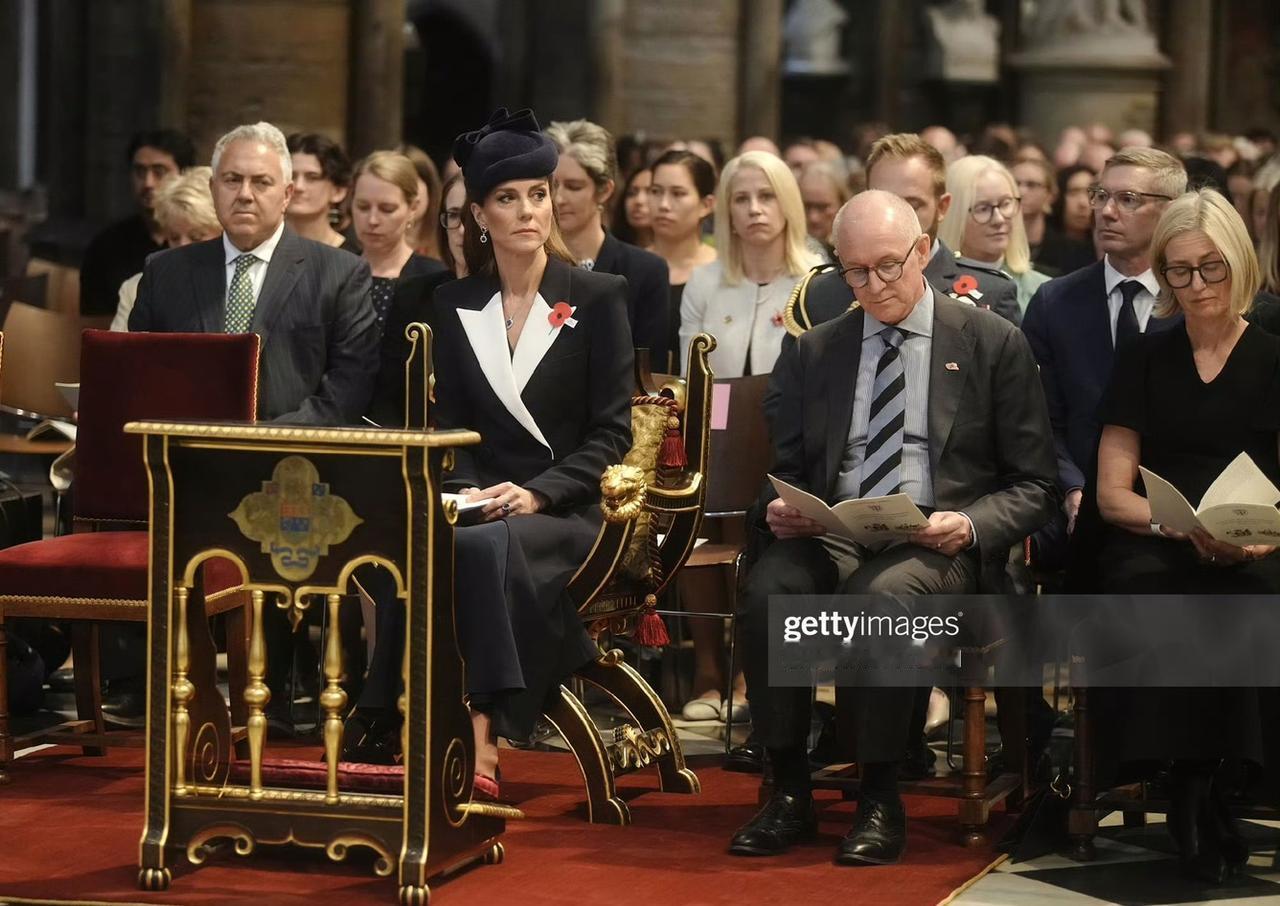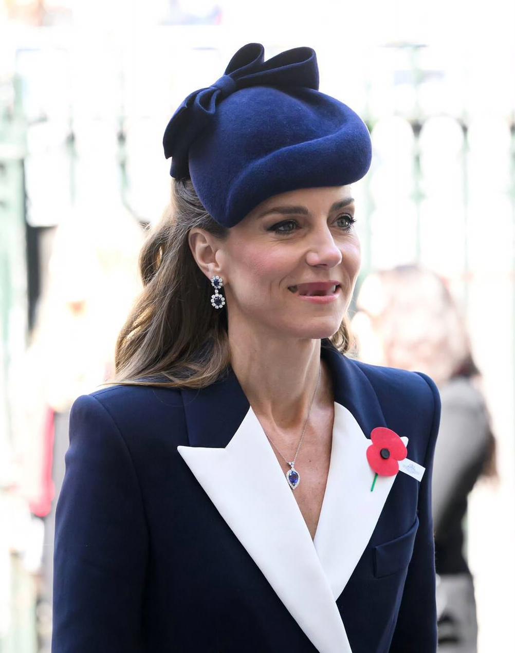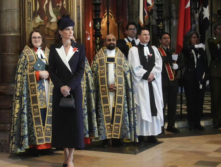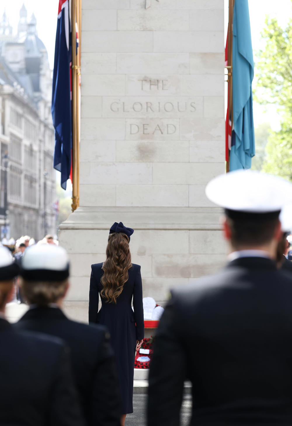 凯特王妃身着一袭蓝色麦昆修身礼服,搭配同色系礼帽,出席英国军队纪念活动。她代表查尔斯三世向阵亡将士敬献花圈,并在西敏寺大教堂主持追思会。 在正式场合中,王妃以蓝色与白色撞色的服装搭配亮相,沉稳庄重。修身的设计简约而高雅。