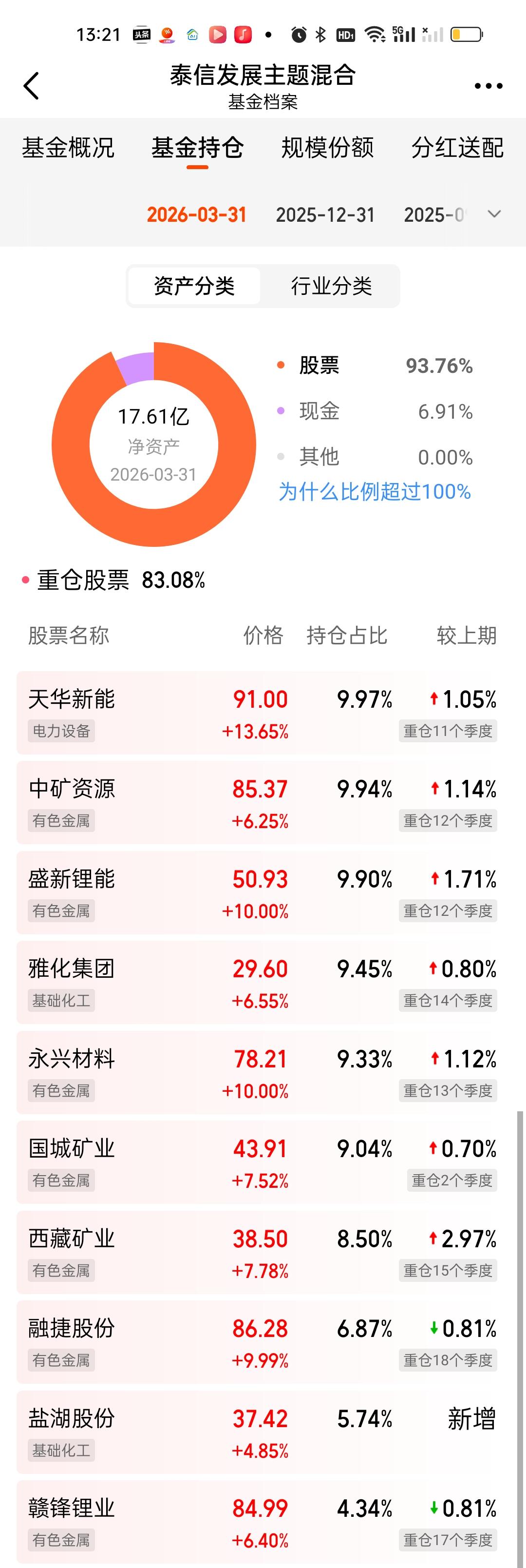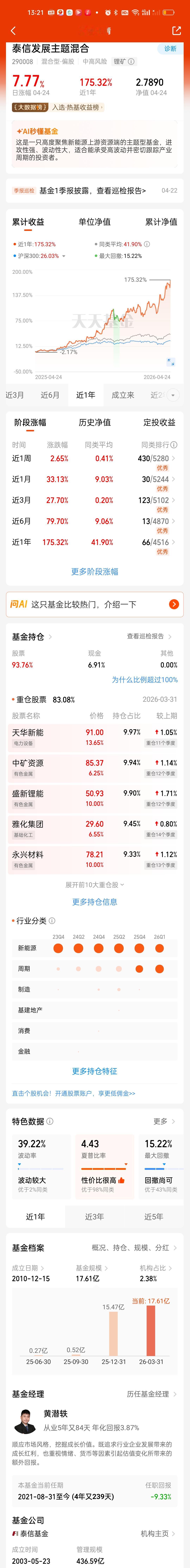 锂矿我们找到了泰信发展主题。它前十大重仓股占比83.08%且回撤率只有15.22%,它不喜欢调仓换股,里面80%的持仓都最少持有了11个季度以上。也就是持有3年以上。风格激进的同时回撤还控制的很好。17.61亿的规模也是刚刚好。