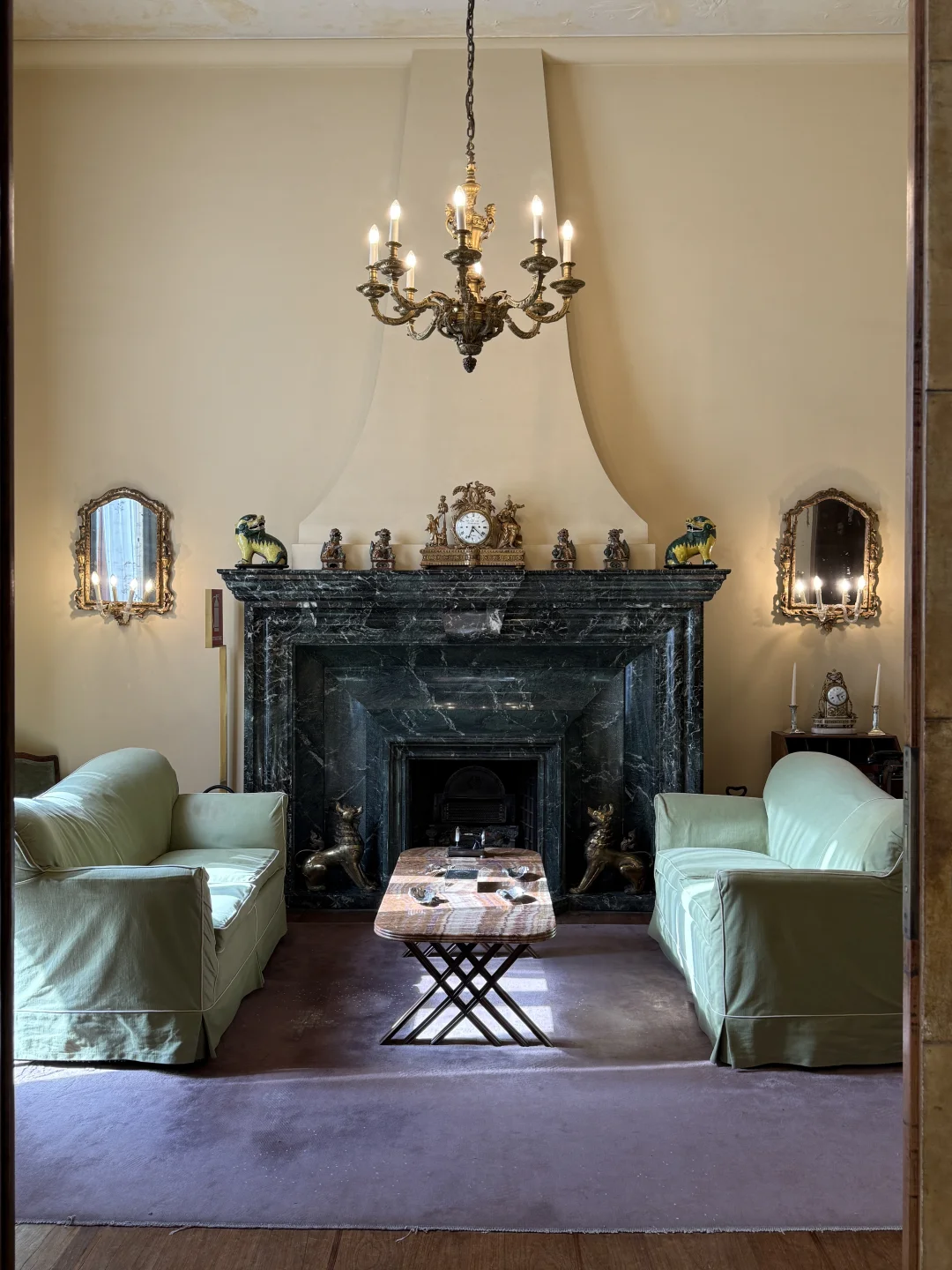 图13深绿色大理石壁炉+浅绿色沙发+紫色地毯+淡红棕色大理石茶几