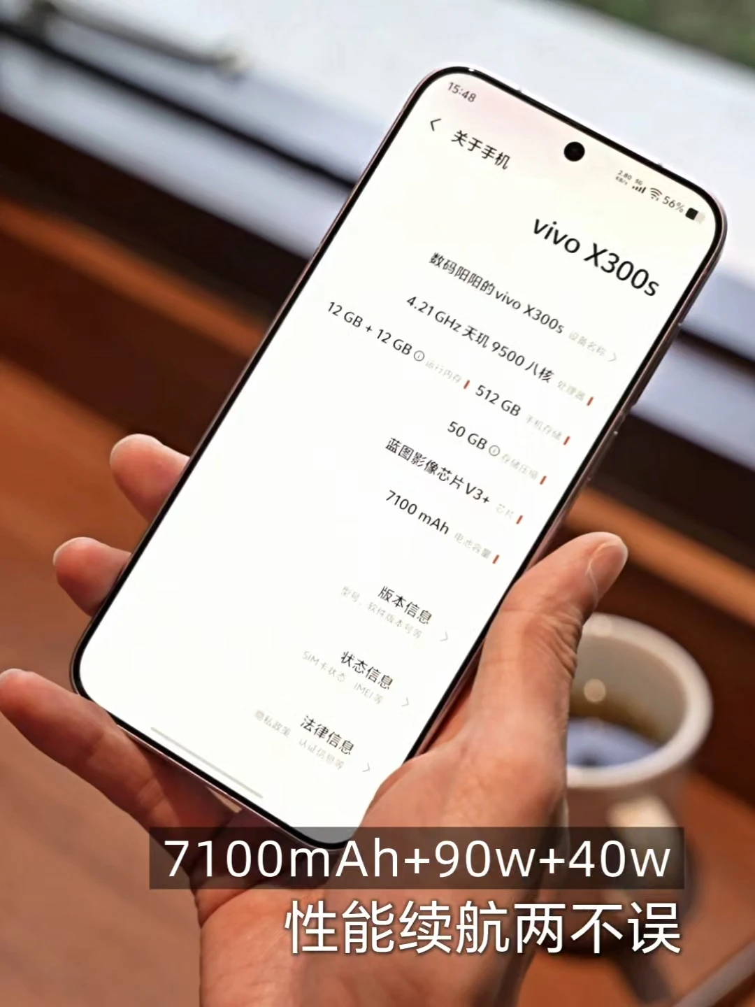 不说别的,手机性能是第一位☝,X300s用天玑9500旗舰处理器,用它游戏开黑或者剪视频都轻轻松松。续航上也没让人失望,7100mAh蓝海电池🔋,90w有线+40w无线快充组合,主打的就是居家旅行都够用。