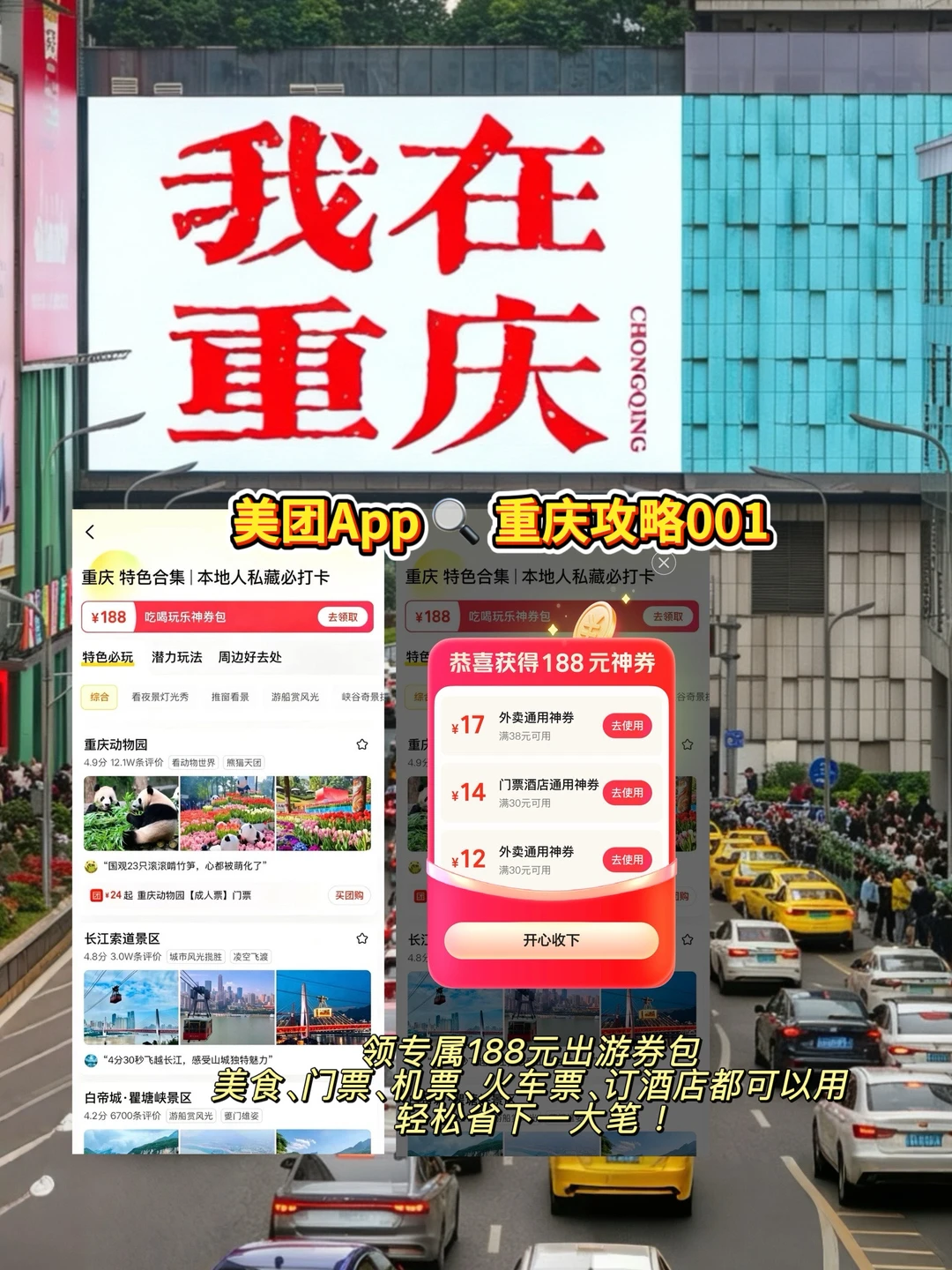 不用费心到处比价、翻攻略挑住处,上美团App🔍重庆攻略001,可领专属188元出游券包超多优惠券,吃喝玩全都能用,好逛好吃又好玩
