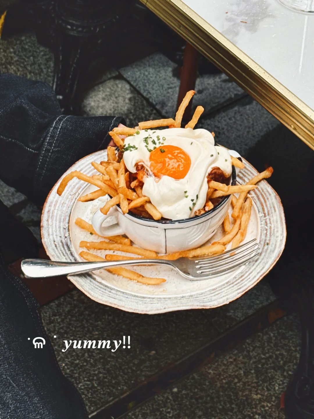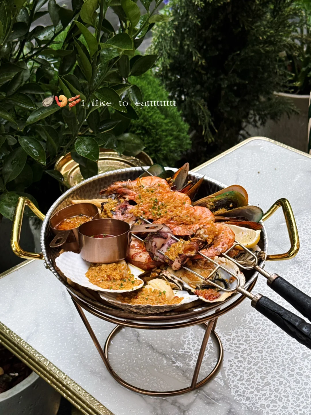 总算是没有千篇一律的薯条了 这个手撕牛肉脏脏薯条细细脆脆的配合蛋液和牛肉风味好特别 !还有他们家的海鲜拼盘也被我干完啦 虾巨大配着蒜蓉酱好香 嗝~