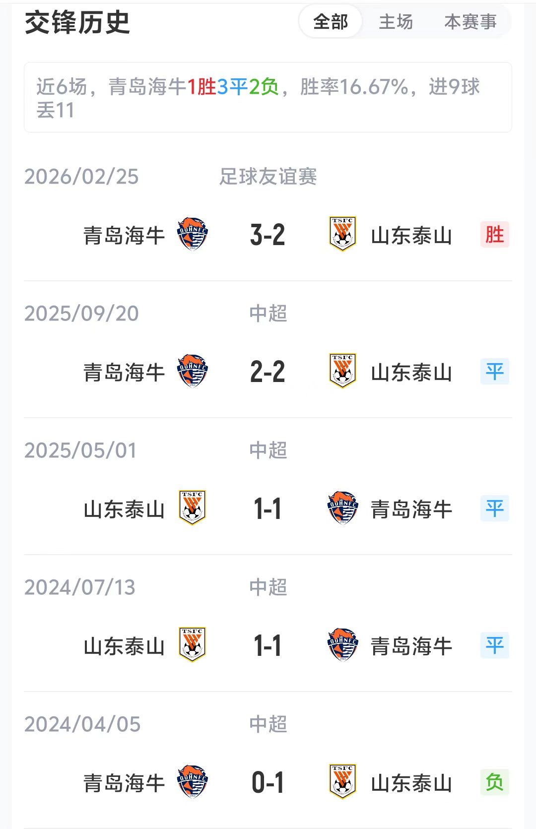 目前,青岛海牛1胜2平4负积-2分排名联赛第16,山东泰山4胜1平2负积7分排名联赛第6。