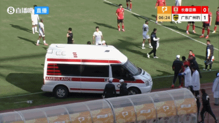 直播吧04月26日讯中甲第6轮,长春亚泰vs广东广州豹。比赛第6分钟,迪力依米提在拼抢中倒地,疑似失去意识,随后救护车进场运送伤员。