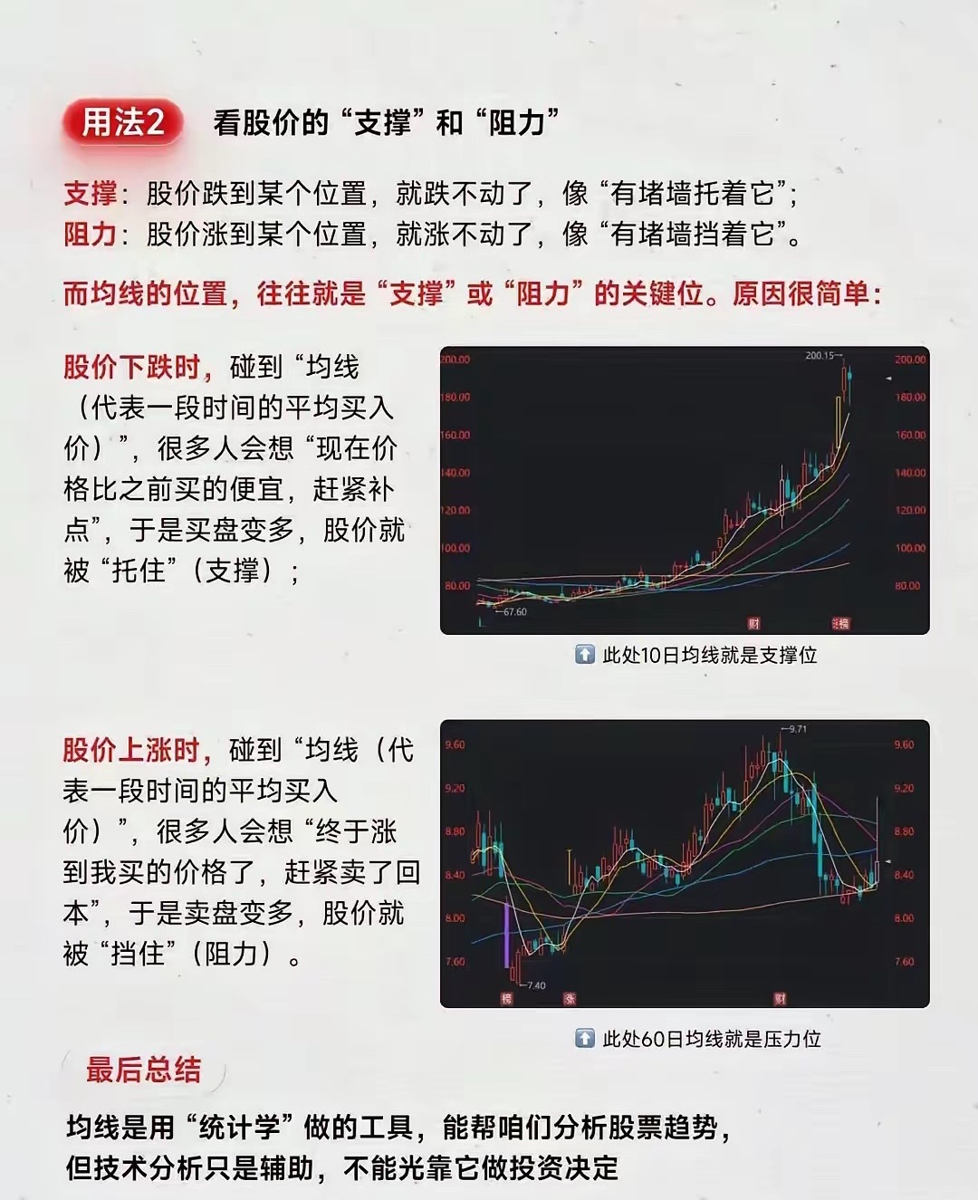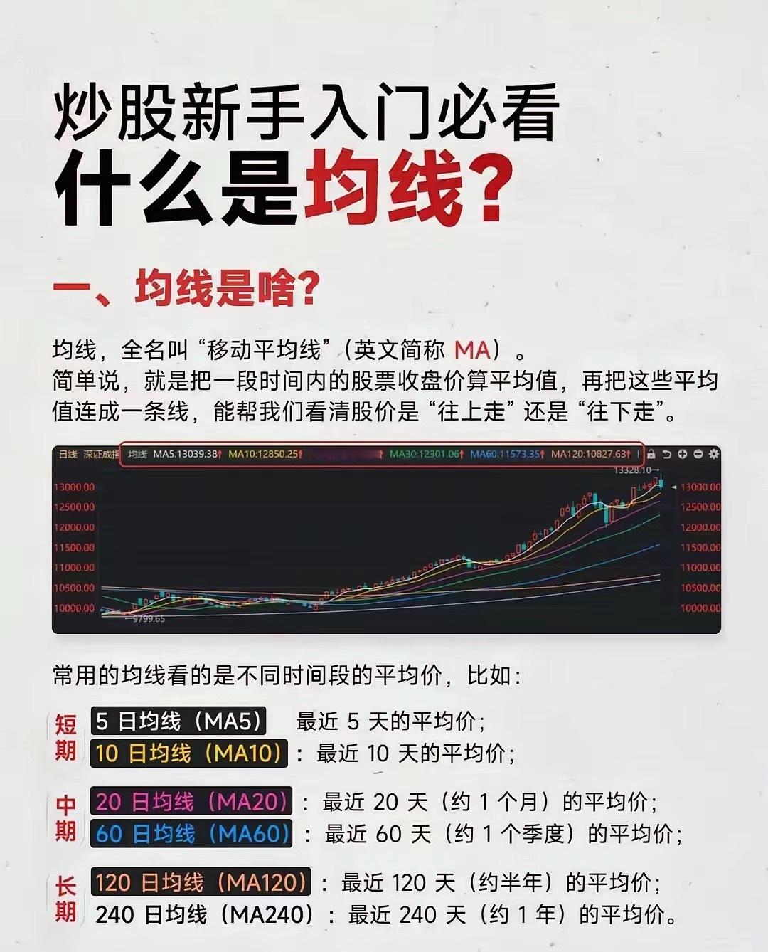 快速看懂均线一、极简交易规则(新手直接照做)1. 股价站上20日线,趋势回暖,可轻仓试错2. 回踩20/30日线缩量企稳,是低吸最佳位置3. 连续缩量回踩均线=主力洗盘4. 放量跌破20日线,果断减仓5. 高位均线粘合后死叉,坚决跑路二、犀利均线口诀(口播专用)1. 五日看情绪,二十定生死。2. 线上持股,线下观望。3. 回踩均线是机会,跌破均线是风险。4. 多头拿得住,空头不乱撸。5. 洗盘不破二十线,趋势行情不用变。
