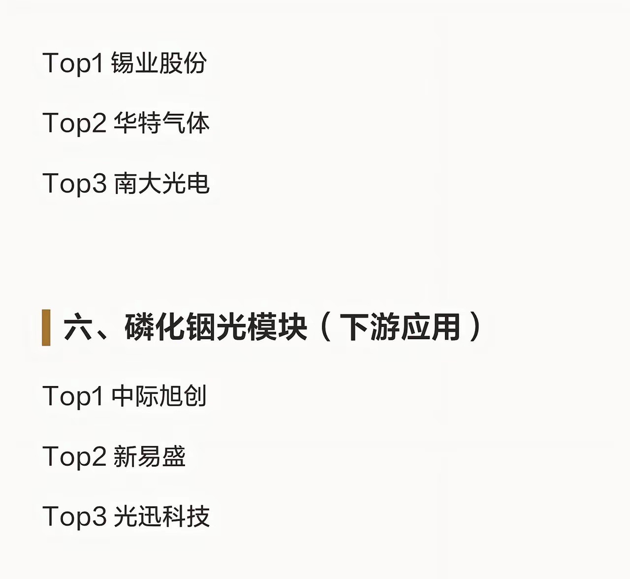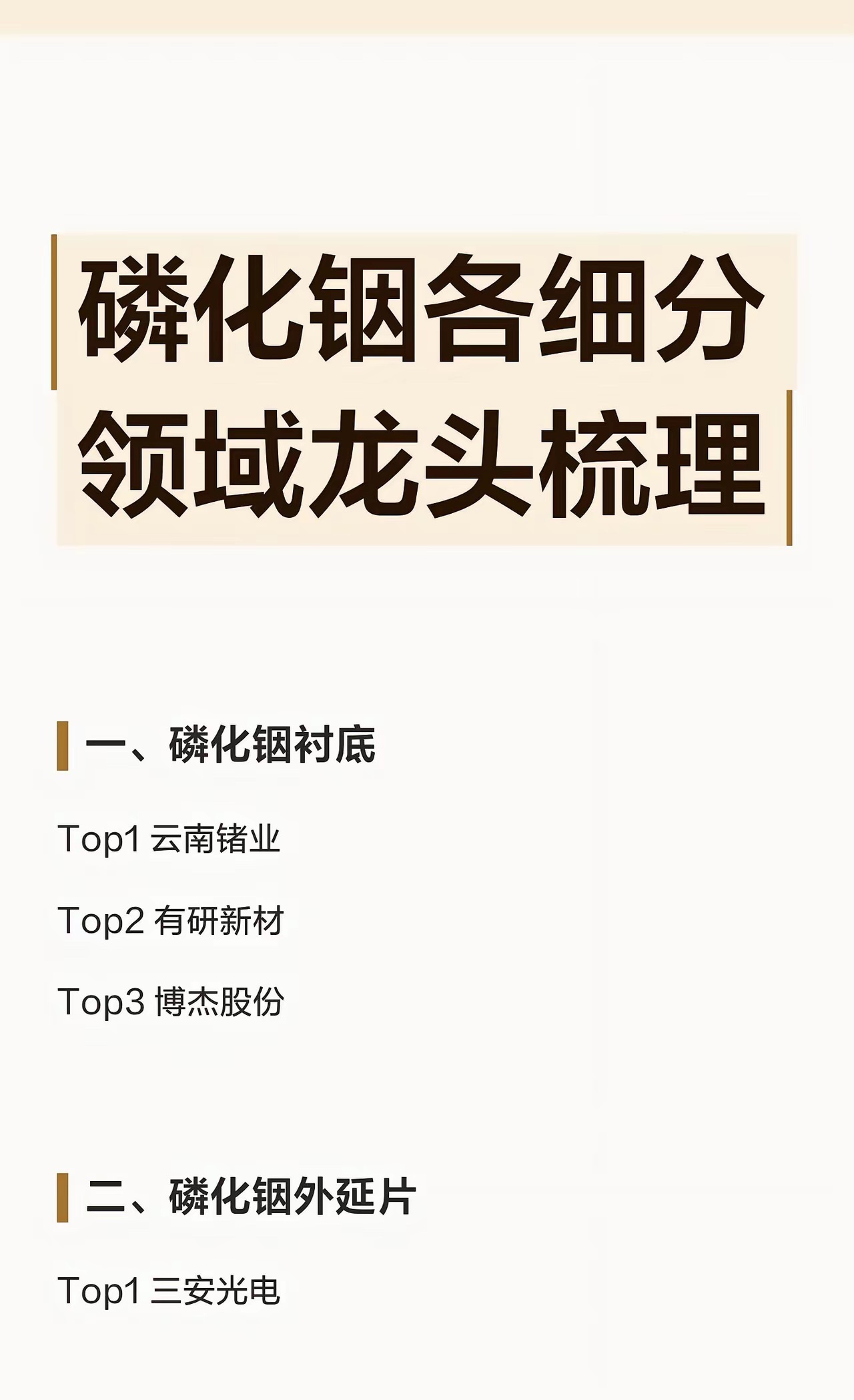 磷化铟各细分领域龙头梳理磷化铟各细分领域龙头梳理一、磷化铟衬底Top1 云南锗业Top2 有研新材Top3 博杰股份二、磷化铟外延片Top1 三安光电Top2 海特高新Top3 铭镓半导体三、磷化铟高速光芯片(EML/DFB)Top1 源杰科技Top2 长光华芯Top3 光迅科技四、磷化铟探测器芯片Top1 光迅科技Top2 三安光电Top3 永鼎股份五、高纯原材料(铟锭 / 特气)Top1 锡业股份Top2 华特气体Top3 南大光电六、磷化铟光模块(下游应用)Top1 中际旭创Top2 新易盛Top3 光迅科技点个关注 下一篇更精彩!