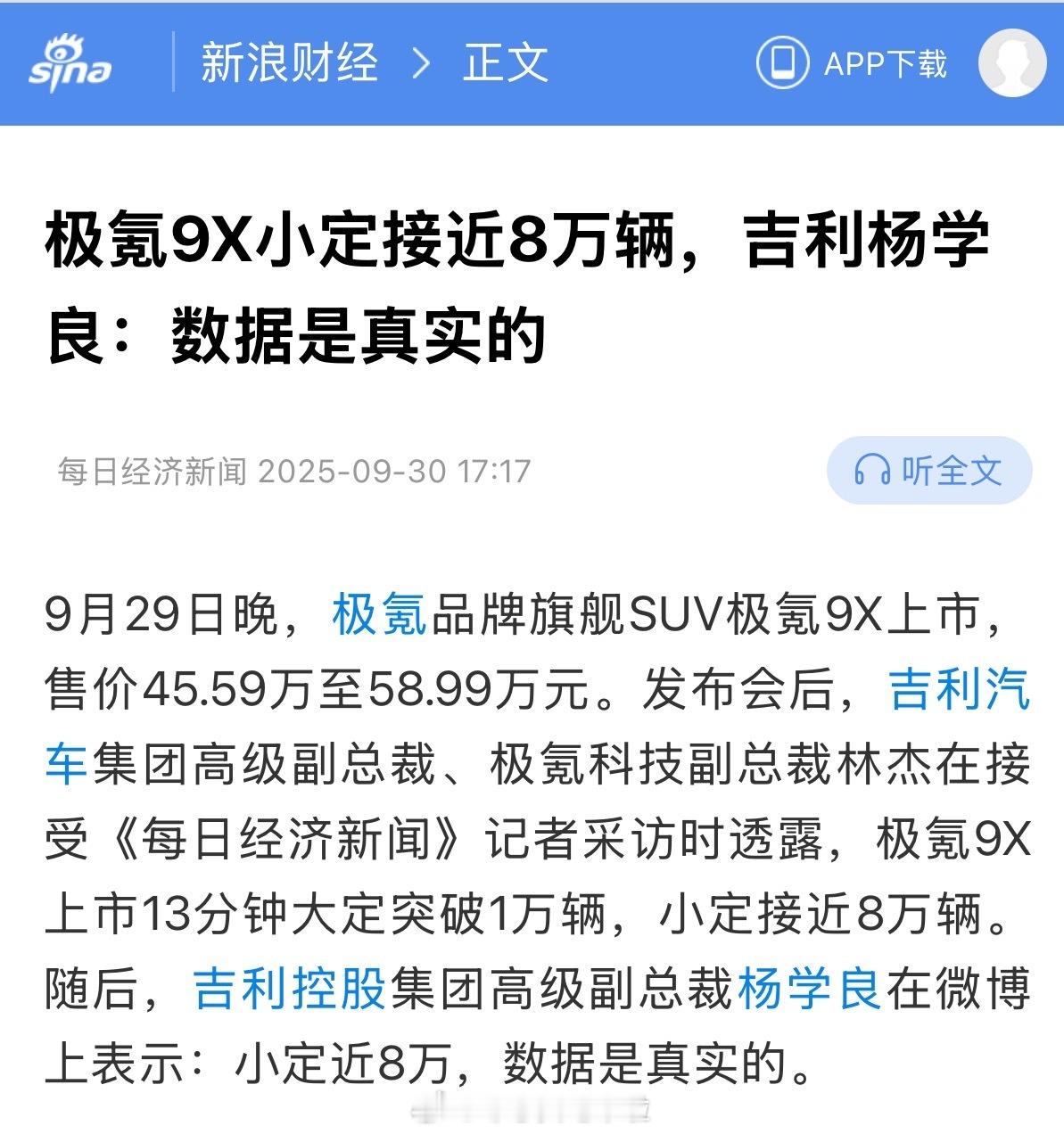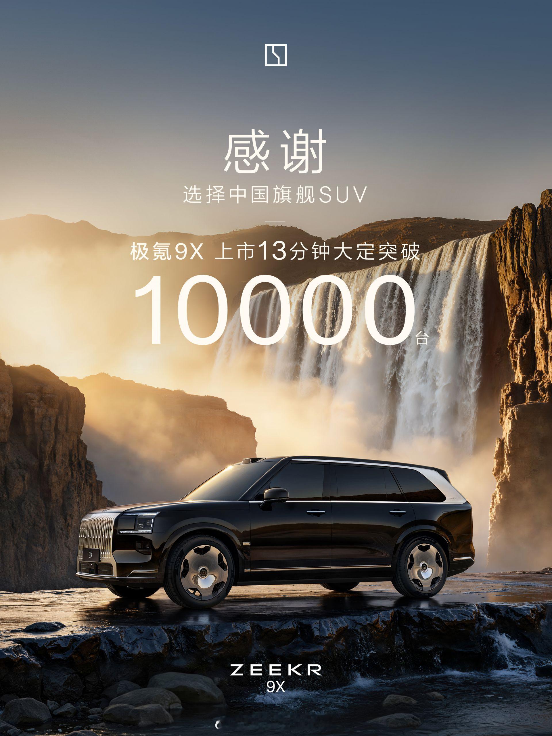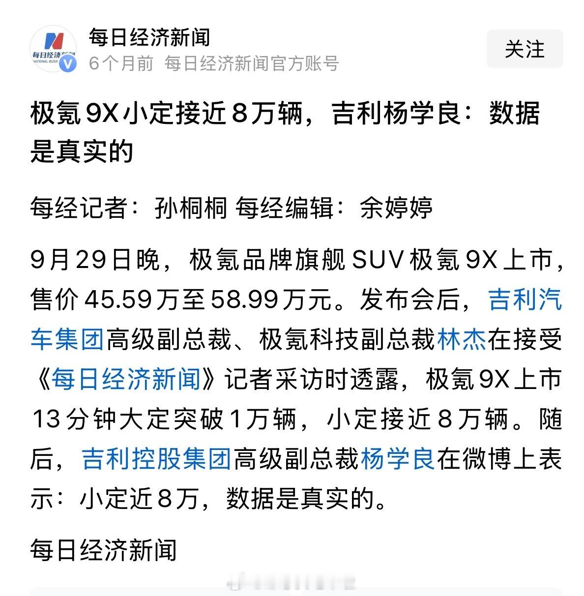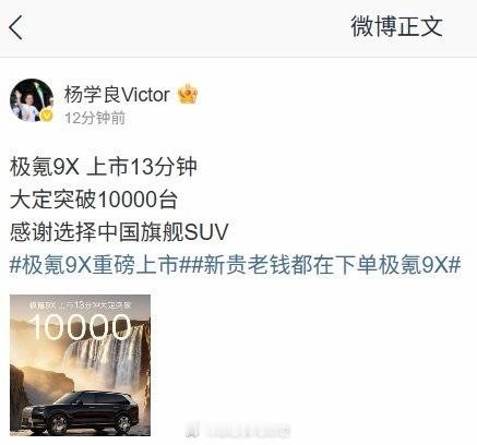 9月29日极氪9X正式上市,官方宣布上市仅13分钟大定便突破1万台,杨学良的微博当时也同步发布了这一信息。