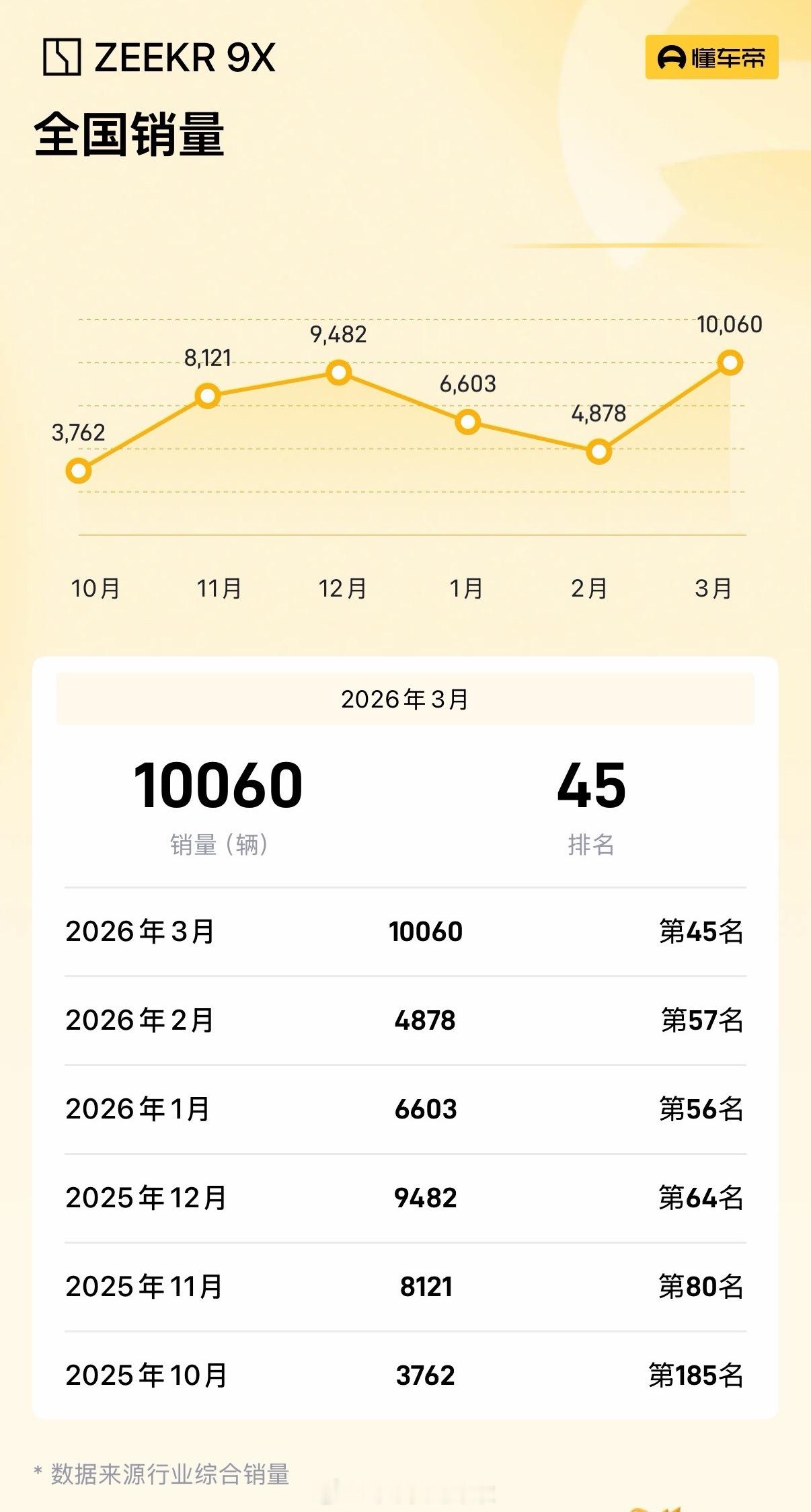 我们接着看交付表现:从2025年10月开始交付,到2026年3月为止,极氪9X在6个月时间里累计交付42906台,最高月交付量突破1万台,达到10060台。
