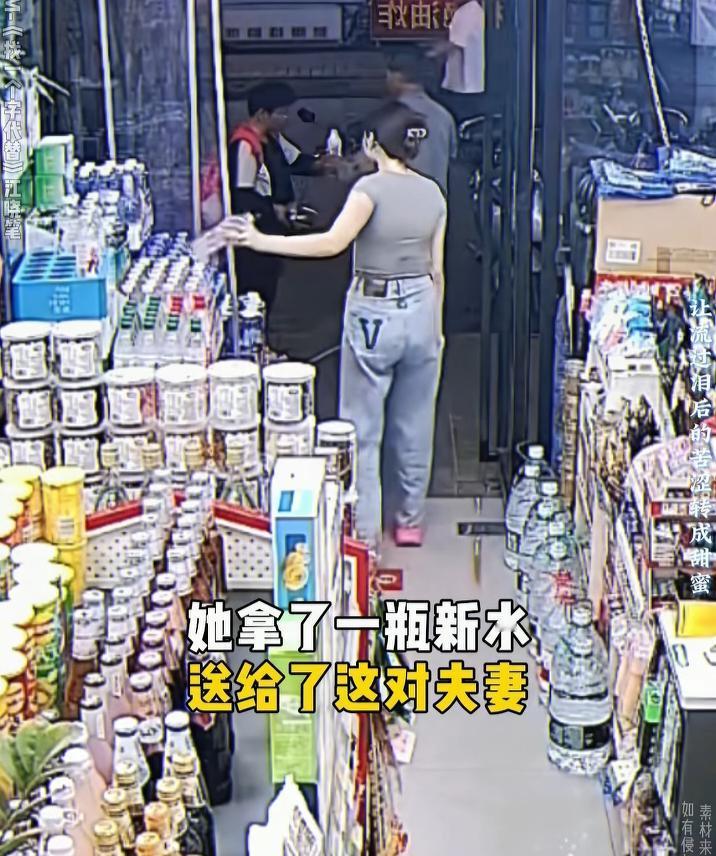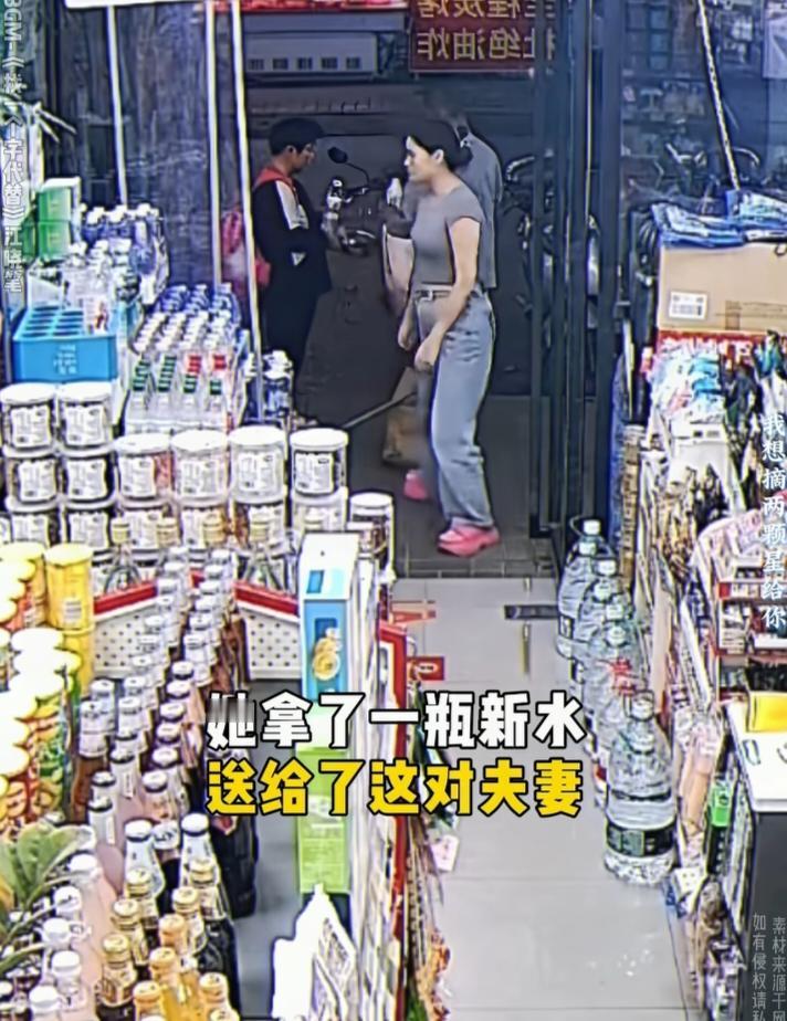 另外一位漂亮的老板娘,用平静而柔和的行动感动了全网。一位夫妇去小店买水,付款用的是皱巴巴的几毛几角的钱。老板娘伸头看了一下门外,还有这位女子的丈夫在等她,看得出夫妻俩生活非常艰难。老板娘一手拿着刚才这位妻子付的钱,另一只手又拿起一瓶新的矿泉水递给了夫妇,没有言语,只有心底那份良善。