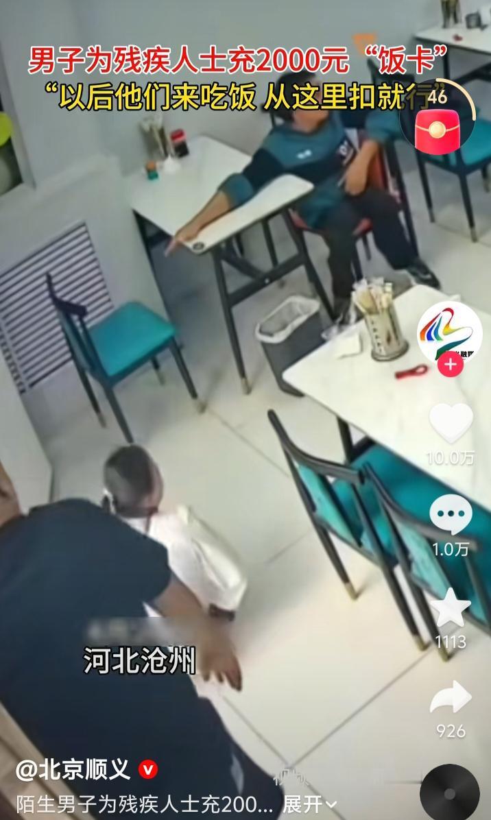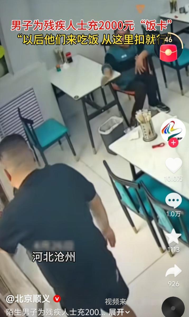 河北沧州一位大哥在一家饭馆吃饭,现场给一位残疾人充值2000元,大哥对饭店老板说,今后他来吃饭就从这里面扣。