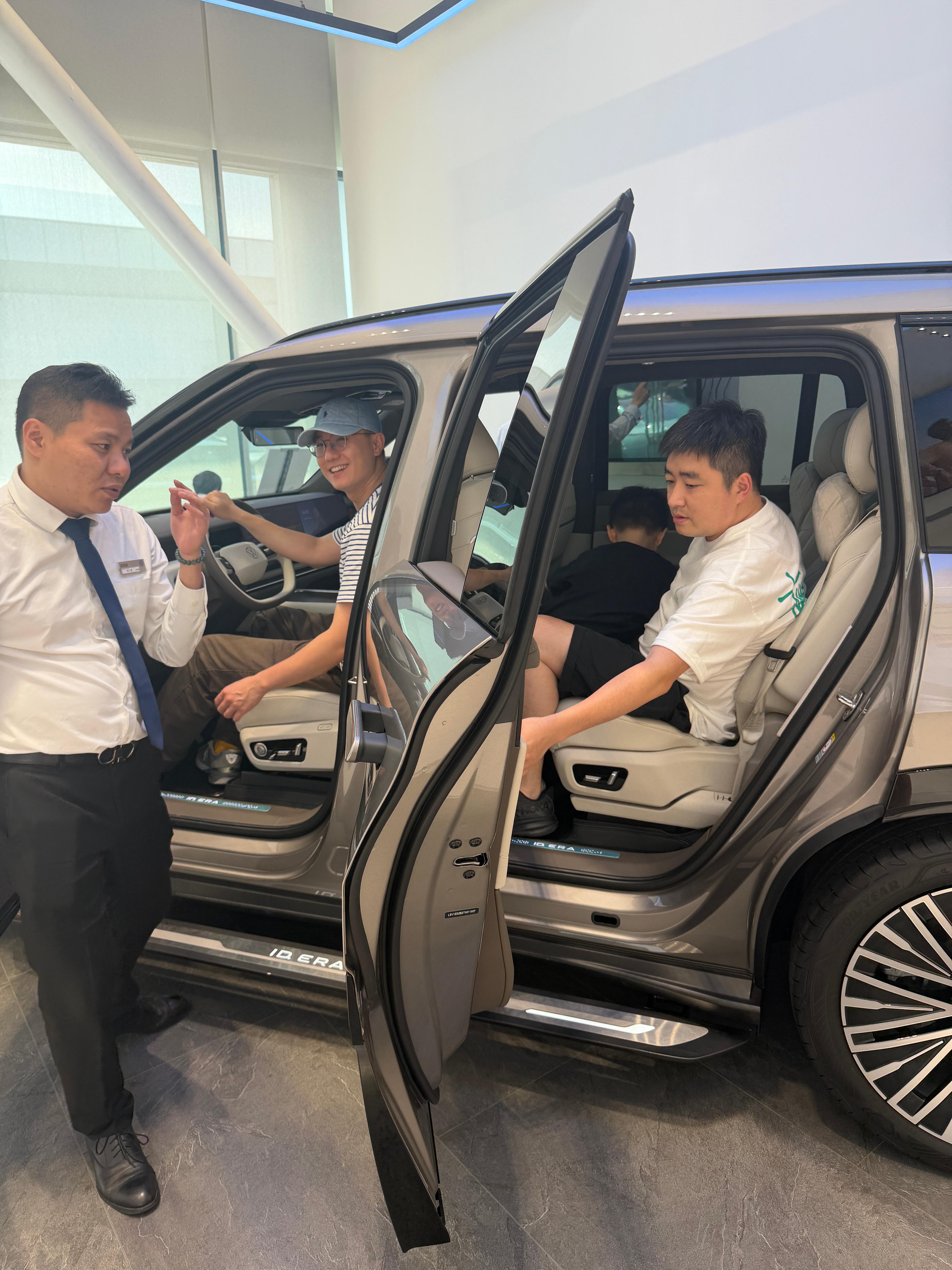 好友家要换新能源大六座suv,目前选择太多了,家门口有大众,我们推荐9x,他们很感兴趣,马上来看,销售说我介绍的很专业,问我是不是要买,建议选宁德逍遥电池的中配版本,纯电续航400左右的,入门版电池只有50几度,纯电续航300。了解了一下,9x买家基本是家里有过大众车的,而且预算充足的家庭用户,大部分是开着豪华传统品牌车来,想换更智能的家用SUV的用户。大众汽车全新以赴idera9x 深圳