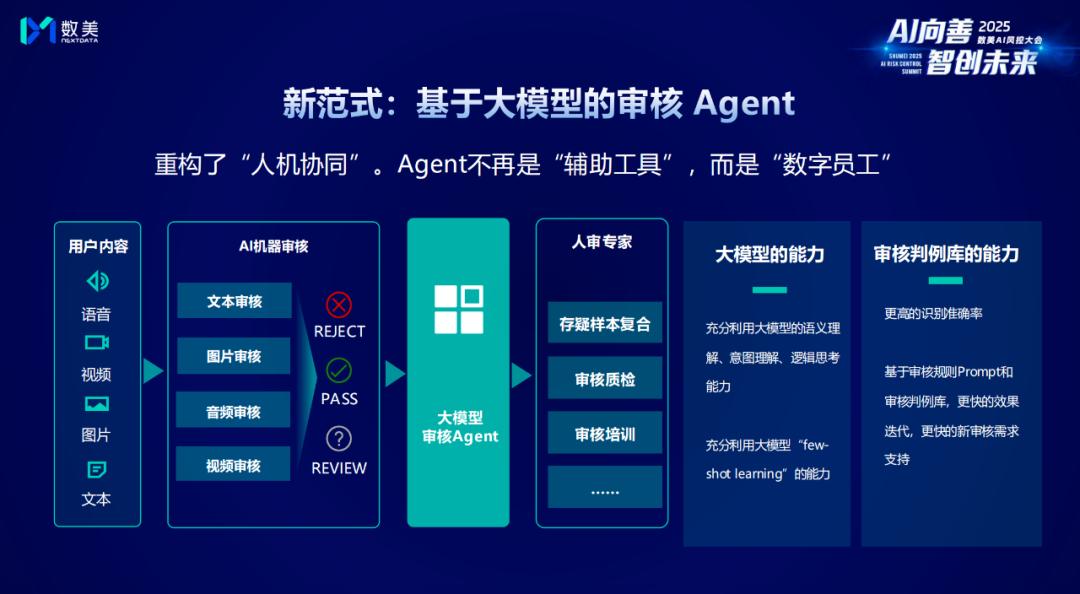 面对 AI 的错误、AI 的侵权及对 AI 的“攻击”等新型挑战,数美重构了“人机协同”模式——引入基于大模型的审核 Agent。