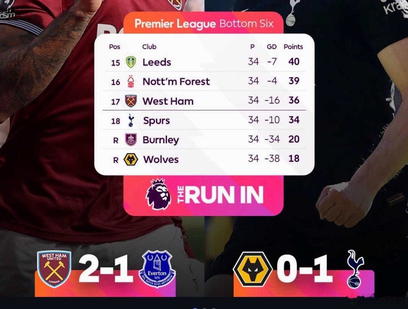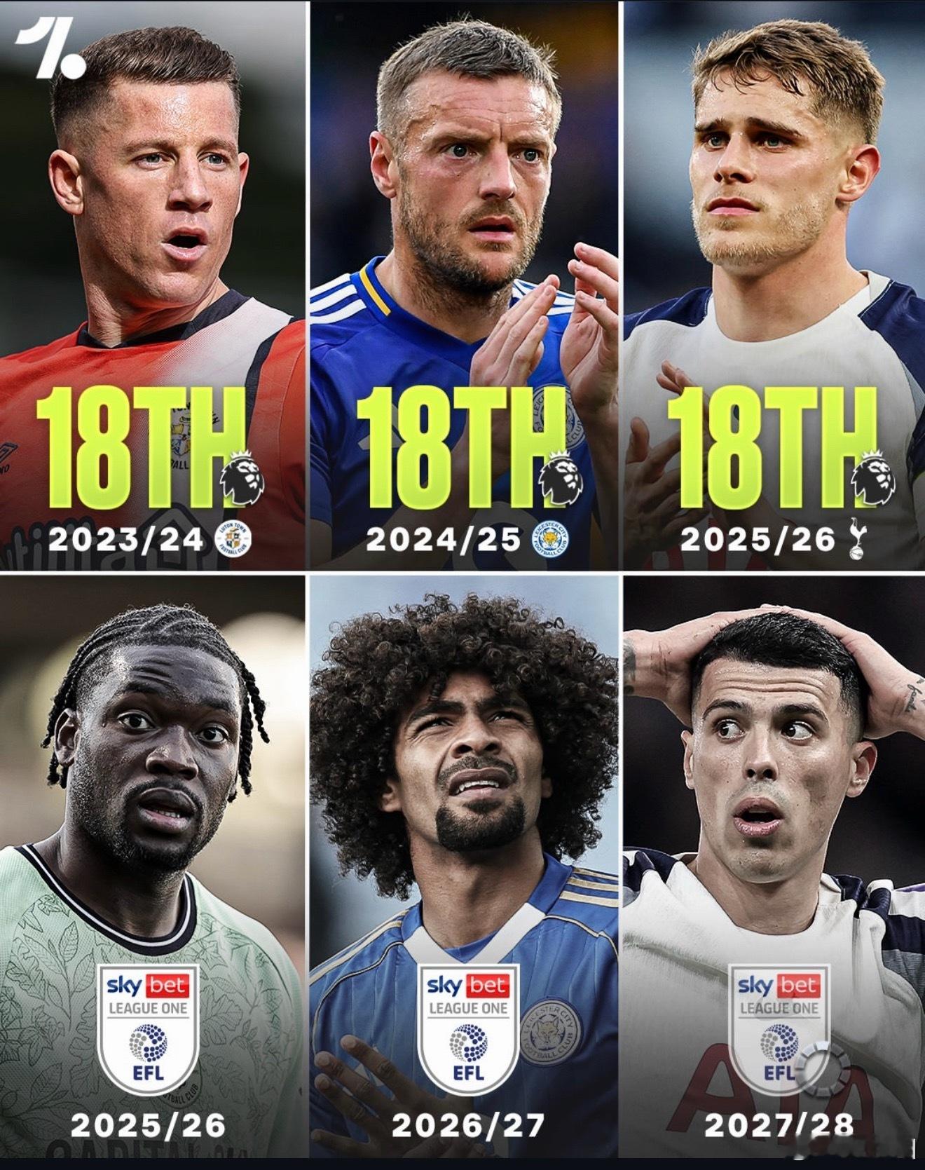 如果热刺最终以英超第 18 名的成绩降级。有一个魔咒就是:过往两个赛季,以英超第 18 名降级的卢顿和莱斯特城队,都遭遇了自由落体式的连降两级。(图二)。卢顿 2023 到 24 赛季还在打英超,目前是在征战英格兰第三级别联赛英甲。莱斯特城去年降入英冠,如今在英冠也遭遇降级,下个赛季将征战英甲。好消息是热刺终于走出此前的连续 15 轮不胜,收获了 2026 年首场英超胜利。坏消息是索兰克和西蒙斯双双受伤,攻击力再次受到影响。热刺如果降级,考虑到第 19 名的伯恩利和他的巨大分差,所以只会以英超第 18 名的名次降级 。没想到本赛季英超降级最后一个名额,居然是在球迷非常熟悉的热刺和西汉姆之间产生。英超