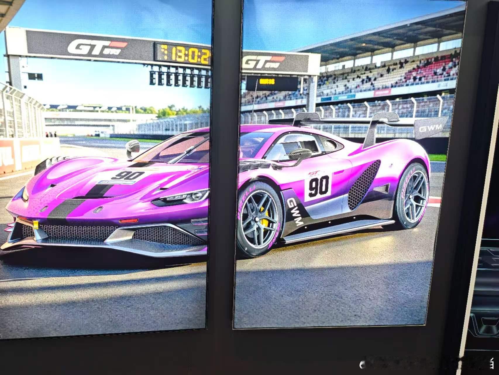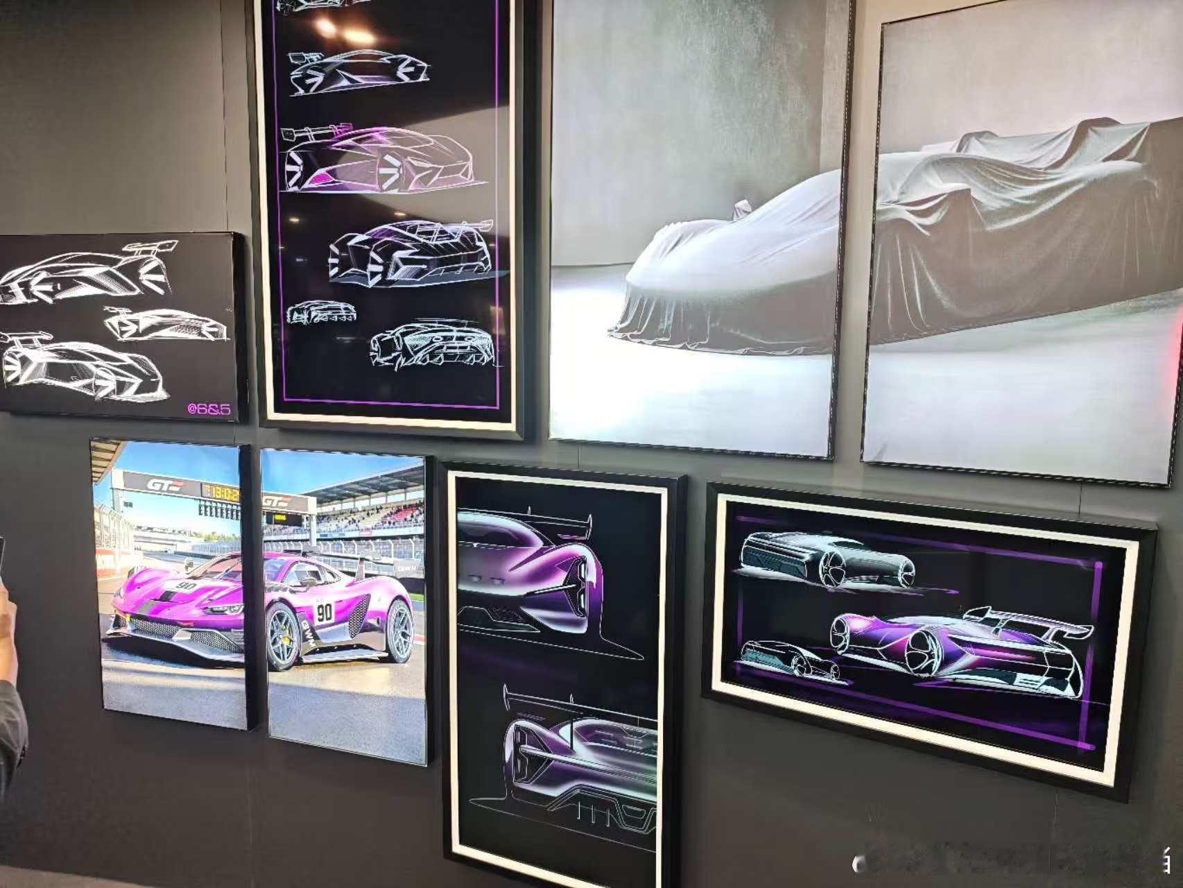 一张图证明你来过北京车展长城的V8混动超跑发动机展区墙上,有几张手绘图,一张渲染图和一张盖着布的实车图。