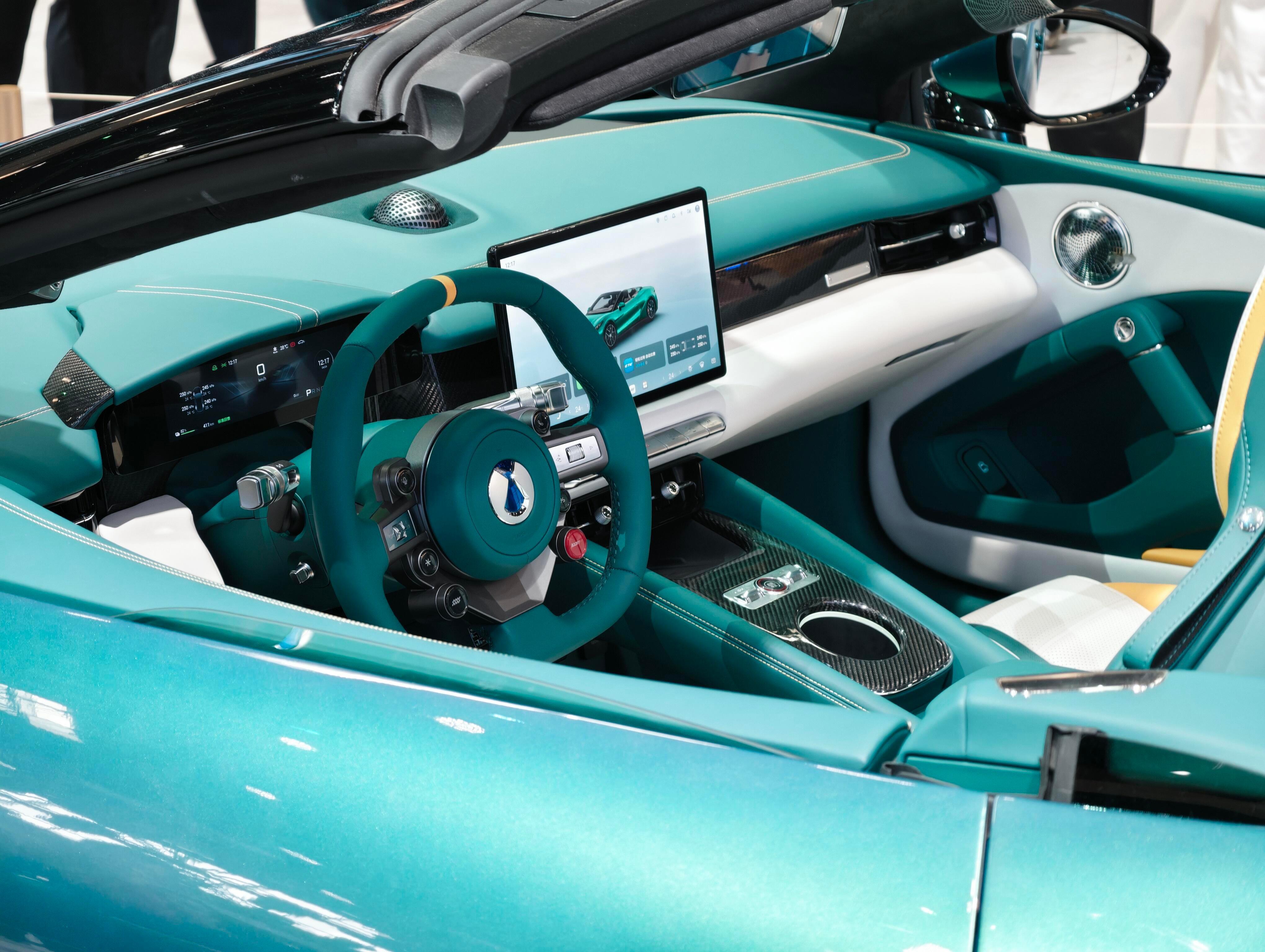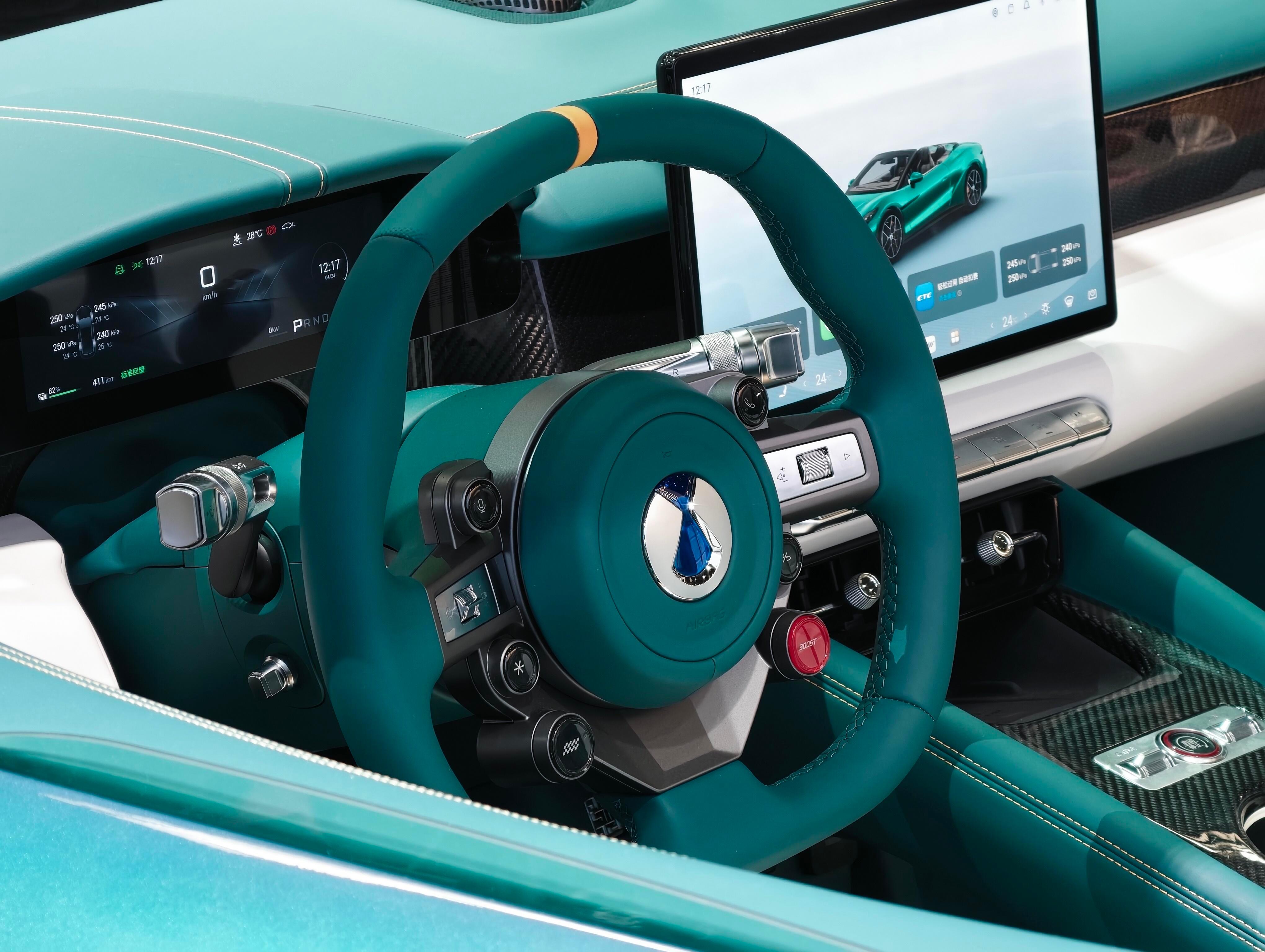 腾势Z纯电敞篷跑车,实车很漂亮,看起来挺薄的,完全没有电动车的厚重感。型面和车漆都挺讲究的,方向盘上有5个卫星按钮腾势