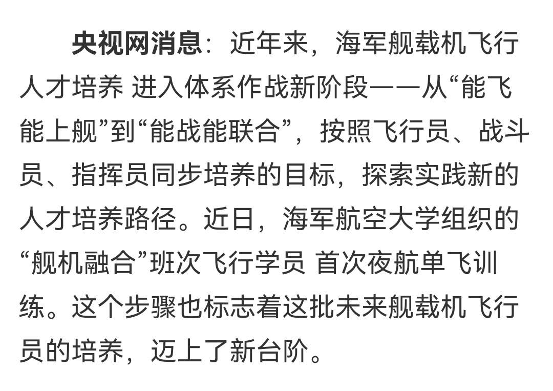 近年来,海军舰载机飞行人才培养进入体系作战新阶段——从“能飞能上舰”到“能战能联合”,按照飞行员、战斗员、指挥员同步培养的目标,探索实践新的人才培养路径。近日,海军航空大学组织的“舰机融合”班次飞行学员首次夜航单飞训练。这个步骤也标志着这批未来舰载机飞行员的培养,迈上了新台阶。