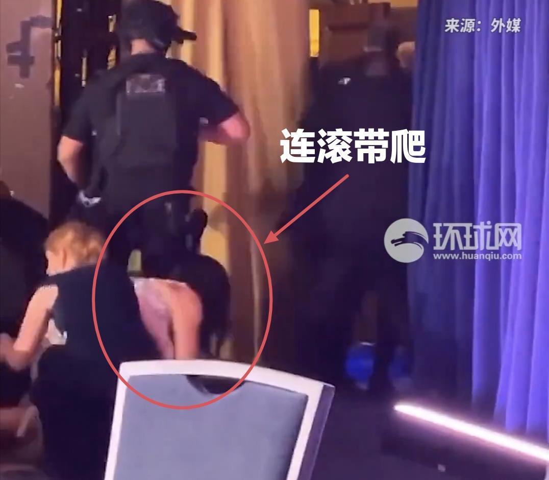 枪击发生前,有人给老特递纸条说话,她在旁边一会微笑,一会张大嘴做惊讶状,是那种让人看着很假的表情,最真实的表情出现在枪响后,她一脸紧张,最后跟在老特身后,趴在地上连滚带爬地出去了,不得不说,还是比较有逃生经验的。