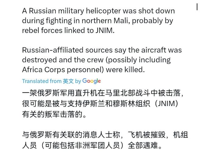 俄罗斯遭遇重大损失,一架俄罗斯军用直升机在马里被击落,机组人员全部死亡!