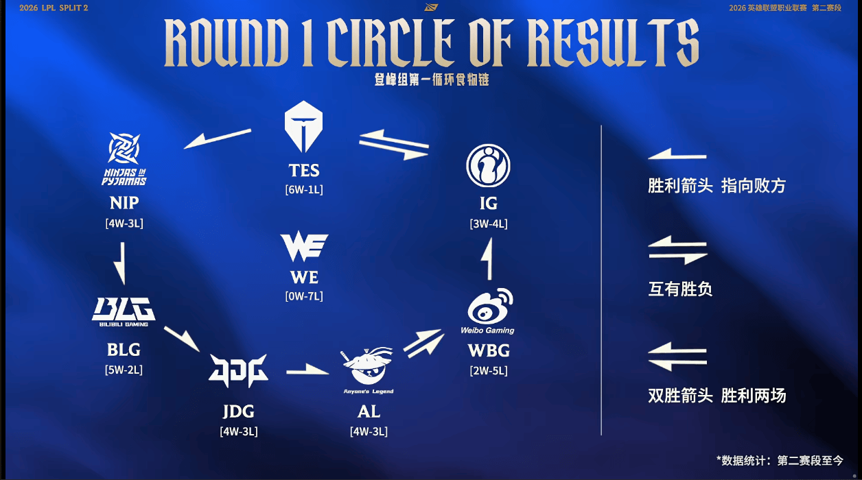 虎扑04月26日讯1.在今天BLG对阵WBG的比赛开始之前,官方给出了登峰组第二赛段截至目前的胜负情况图,其中登峰组各队形成胜负闭环,仅WE未尝一胜