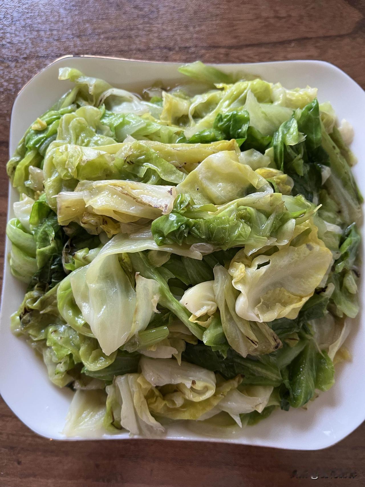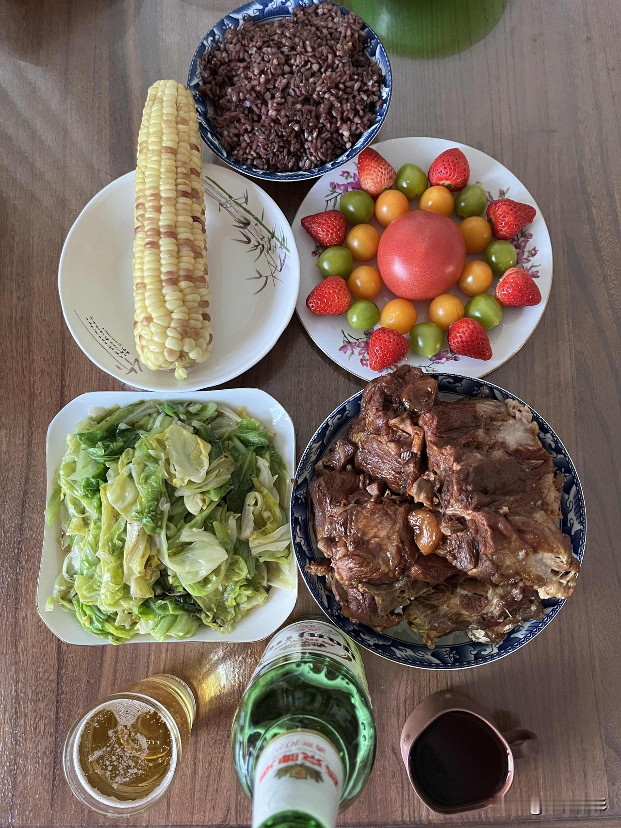 吃了两天素点儿的,今天做了酱梅花骨,荤菜有了再炒一个素菜,晚上做了手撕包菜,一荤一素一个果盘,主食杂粮饭和玉米。