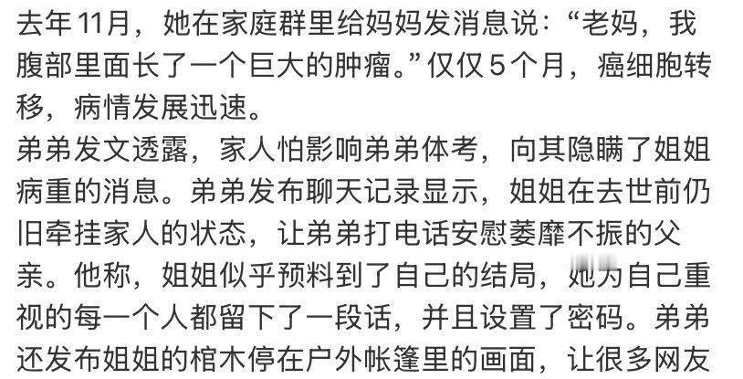 一位25岁湖南女孩"克拉姐姐"因腹部巨大黑色素瘤确诊仅5个月便不幸离世,生前计划订婚却因当地未婚女性棺木禁入家门的习俗,遗体被迫停于户外帐篷,弟弟含泪发布的悼念内容引发70万网友共鸣。