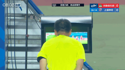 直播吧04月26日讯中超第8轮,河南vs上海申花,比赛第35分钟,特谢拉禁区内倒地,VAR介入,主裁判罚点球。
