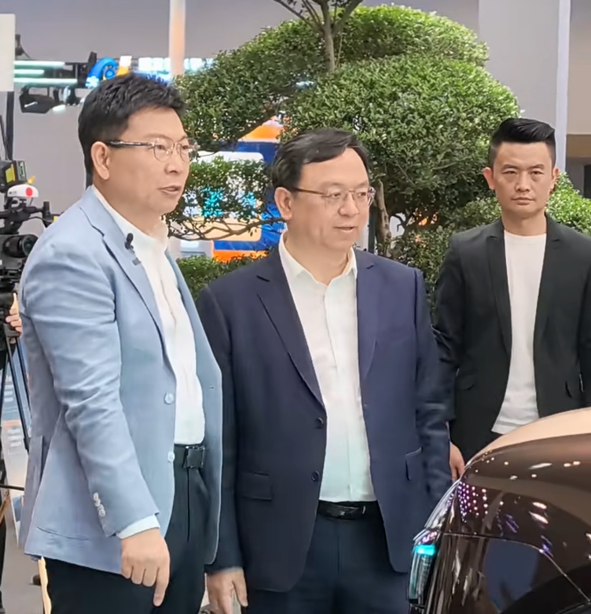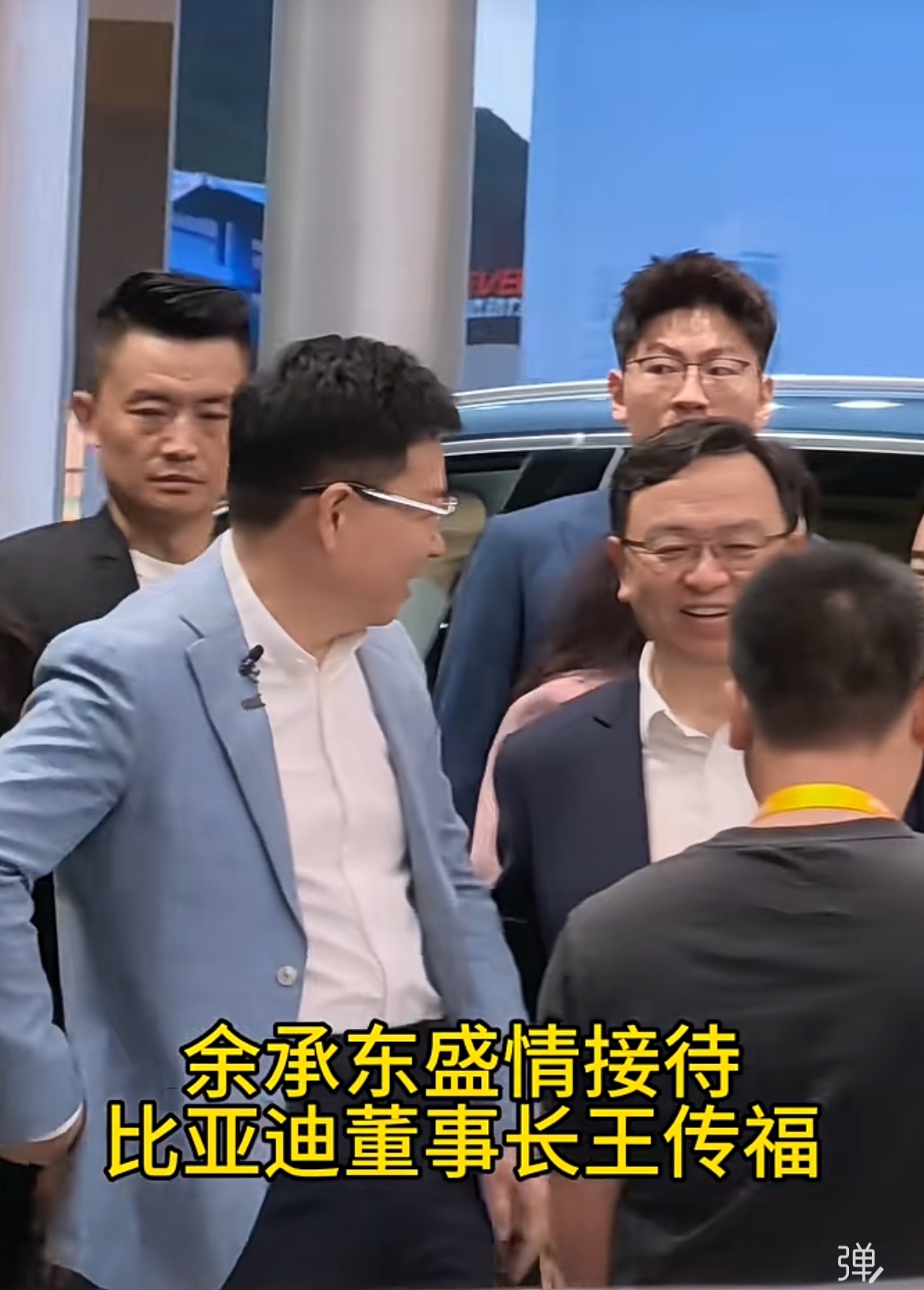 4月26日,比亚迪董事长王传福造访问界展台,与余承东互动交流。余总亲自介绍新问界M9。