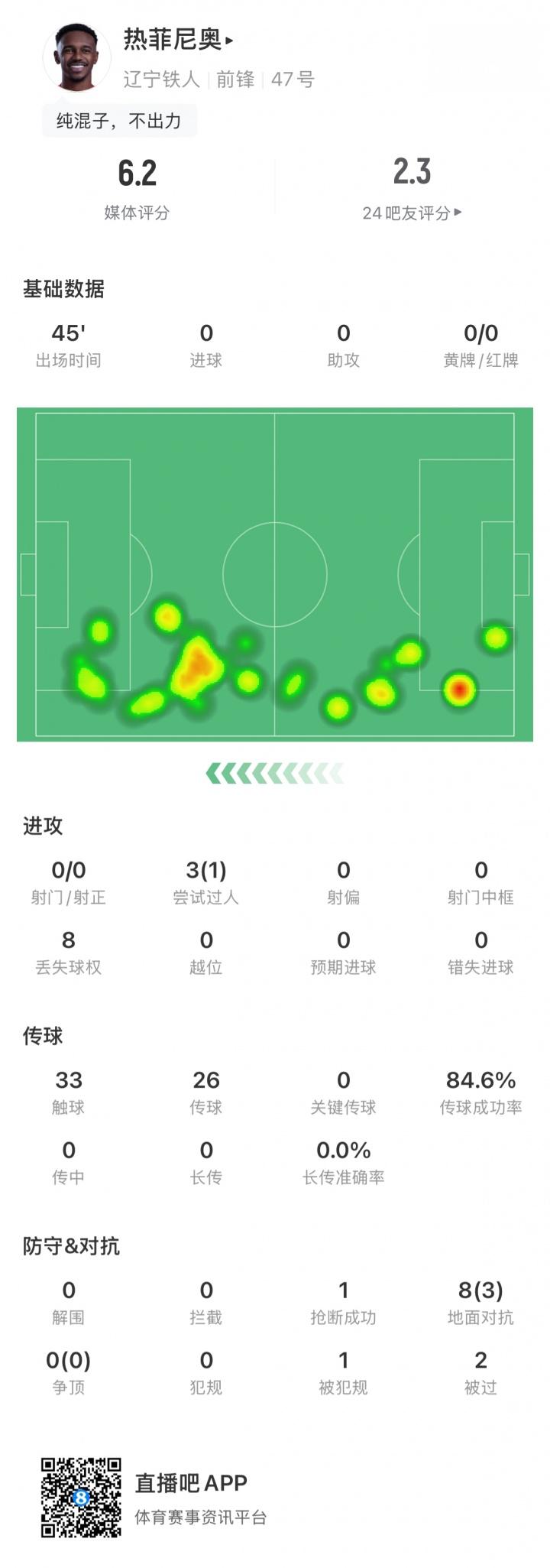 热菲尼奥年初加盟铁人,他身价450万欧,是中超身价最高的球员。本场比赛他0射门,3次过人1次成功,多项数据挂零。中超前8轮比赛他均首发登场,但仅打入1球。