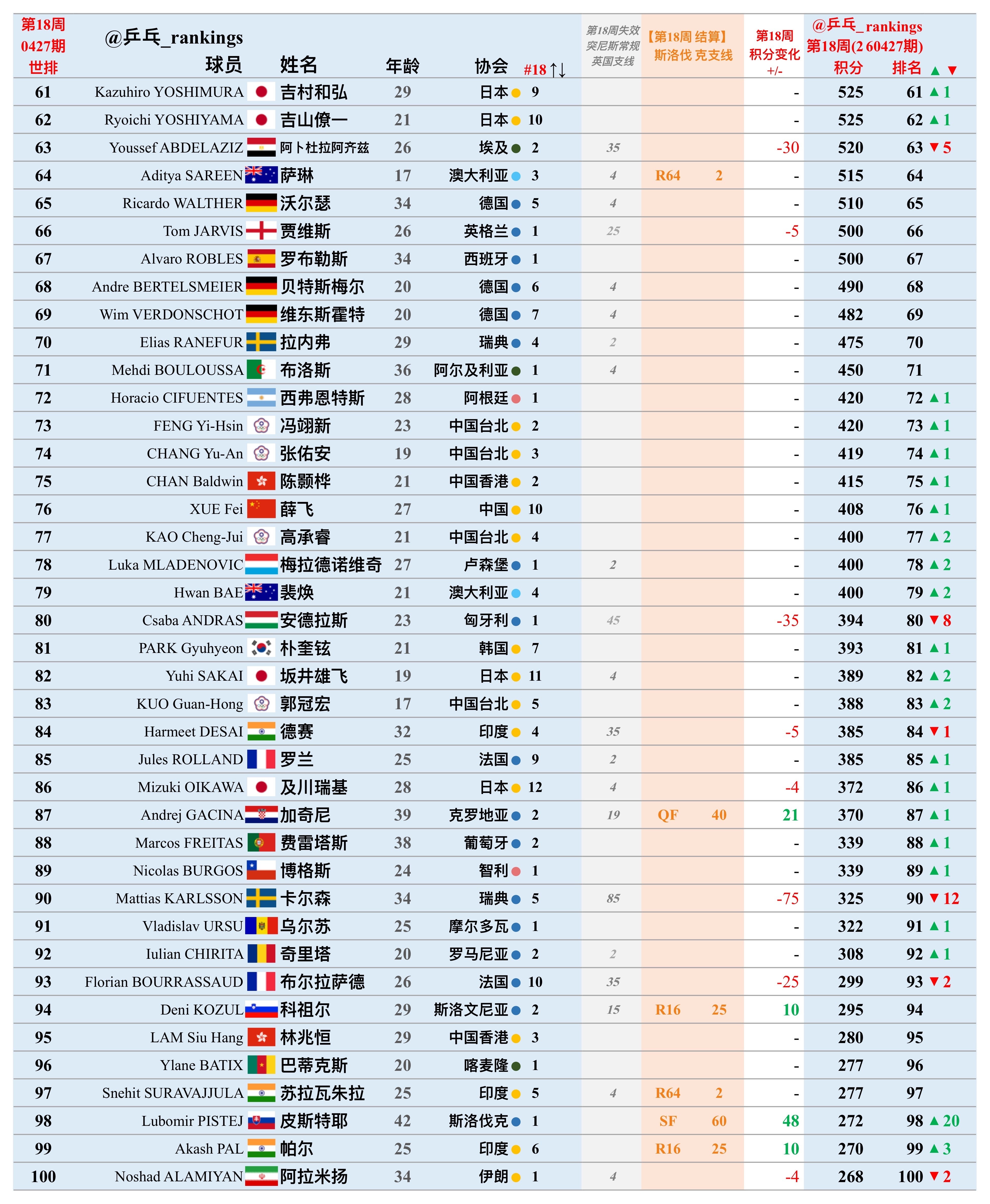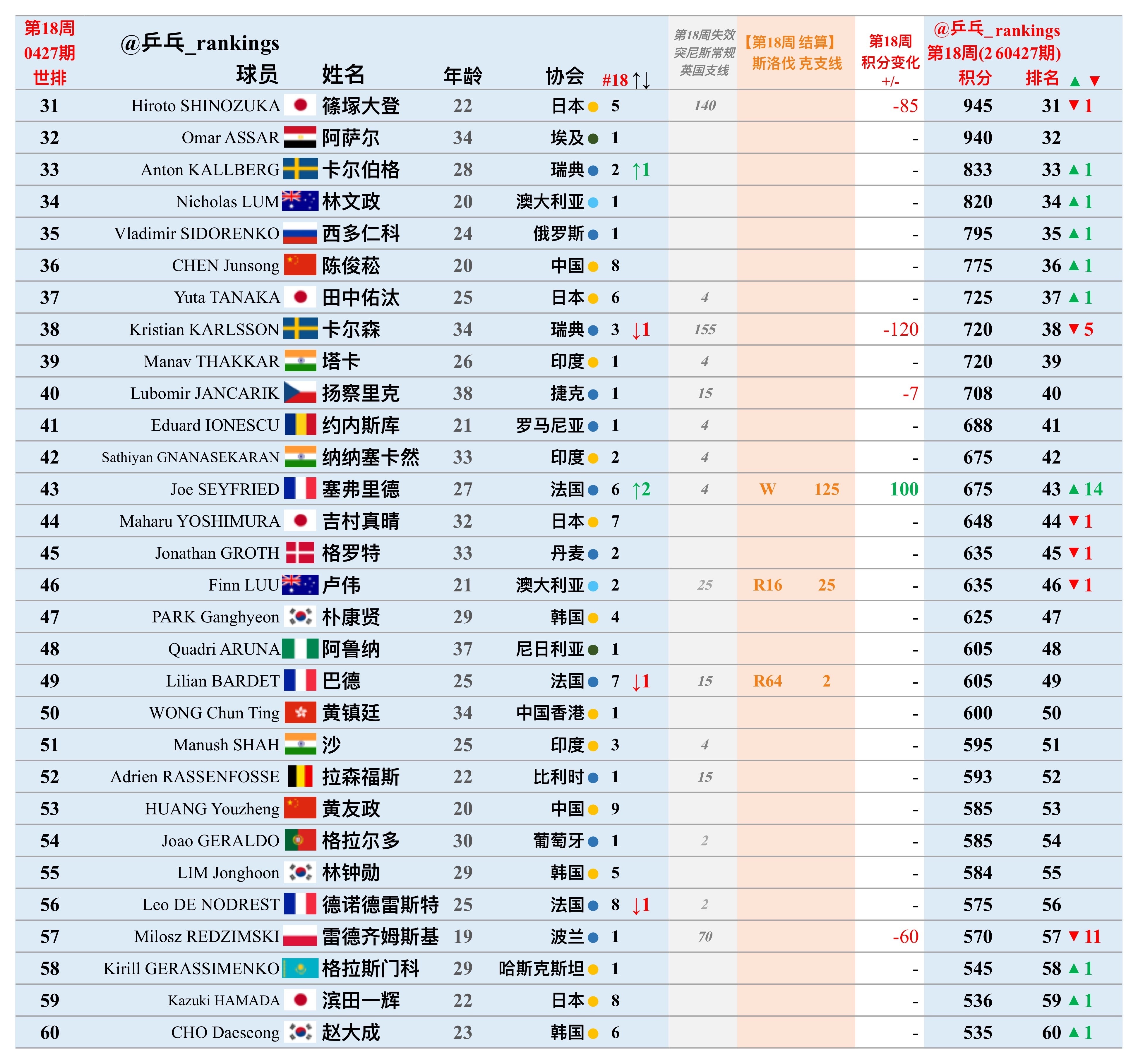 第18周世排积分变化(20260427期)【男单】🔺本周结算• WTT斯洛伐克支线2026🔻本周失效• WTT突尼斯常规挑战赛2025• WTT曼彻斯特支线2025
