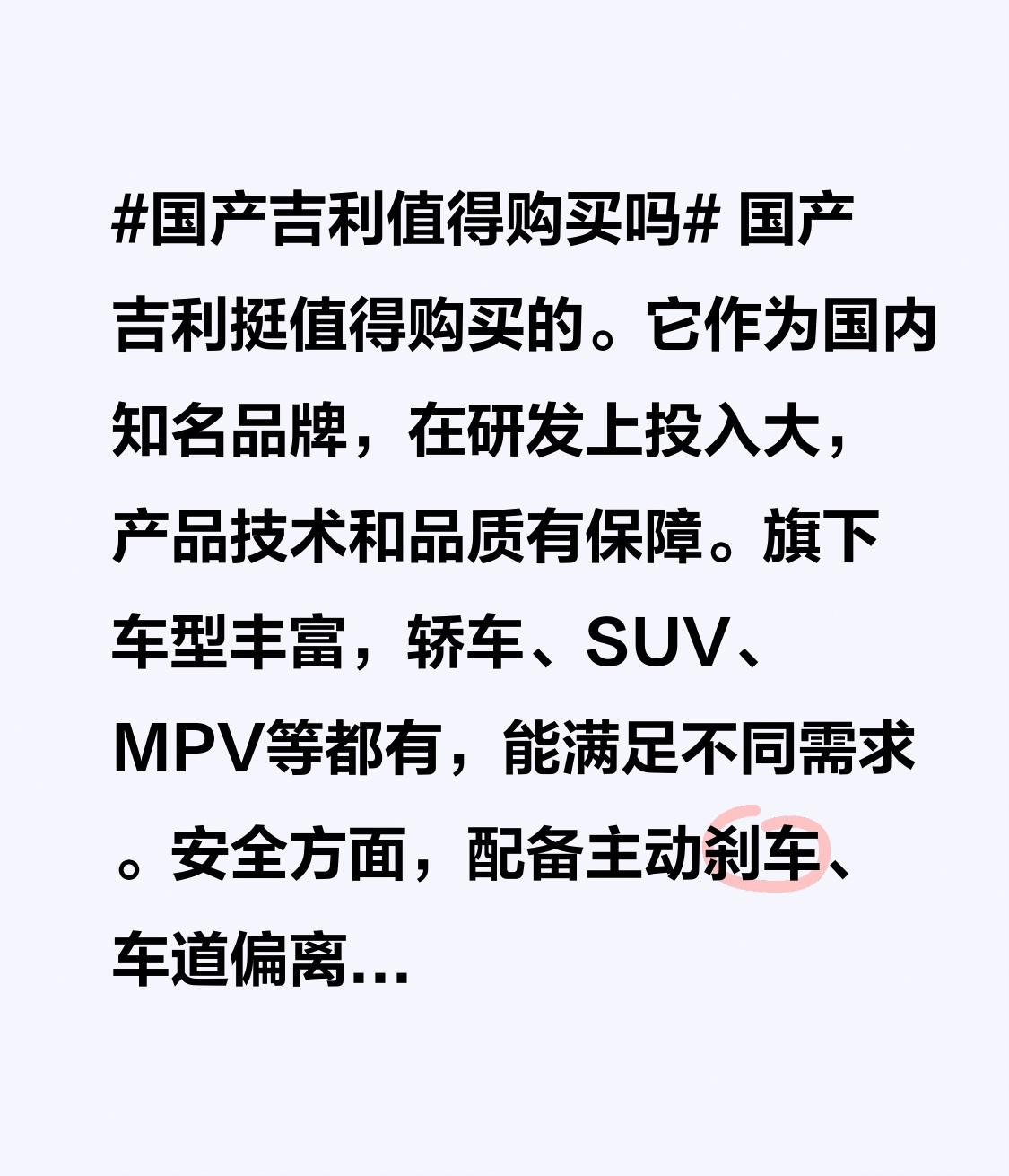国产吉利挺值得购买的。它作为国内知名品牌,在研发上投入大,产品技术和品质有保障。旗下车型丰富,轿车、SUV、MPV等都有,能满足不同需求。