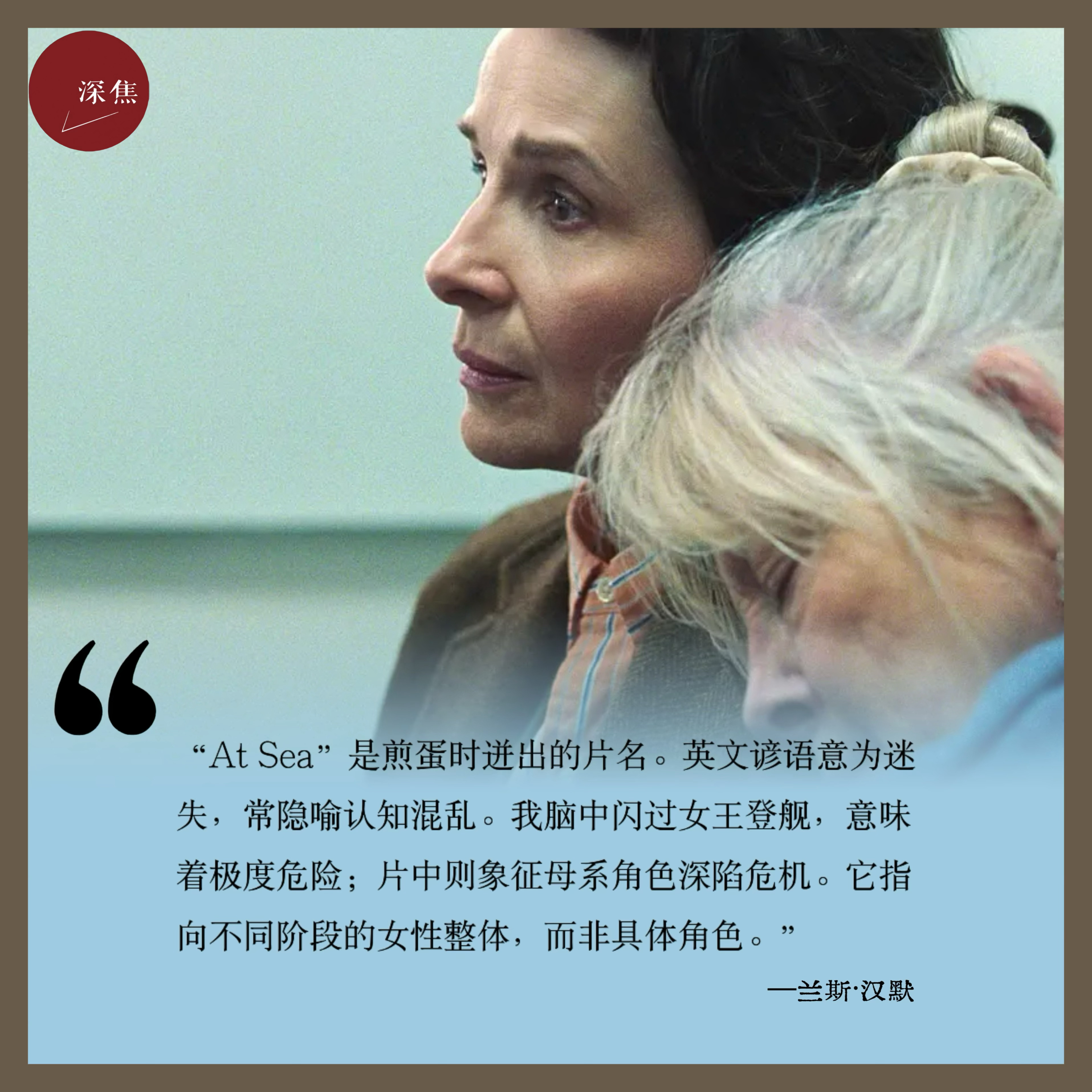 兰斯·汉默谈到片名“At Sea”的由来:那是他在煎蛋时迸出的。英文谚语意为迷失,常隐喻认知混乱。他说脑中闪过女王登舰的画面,意味着极度危险。在片中它象征母系角色深陷危机,指向不同阶段的女性整体,而非具体角色。