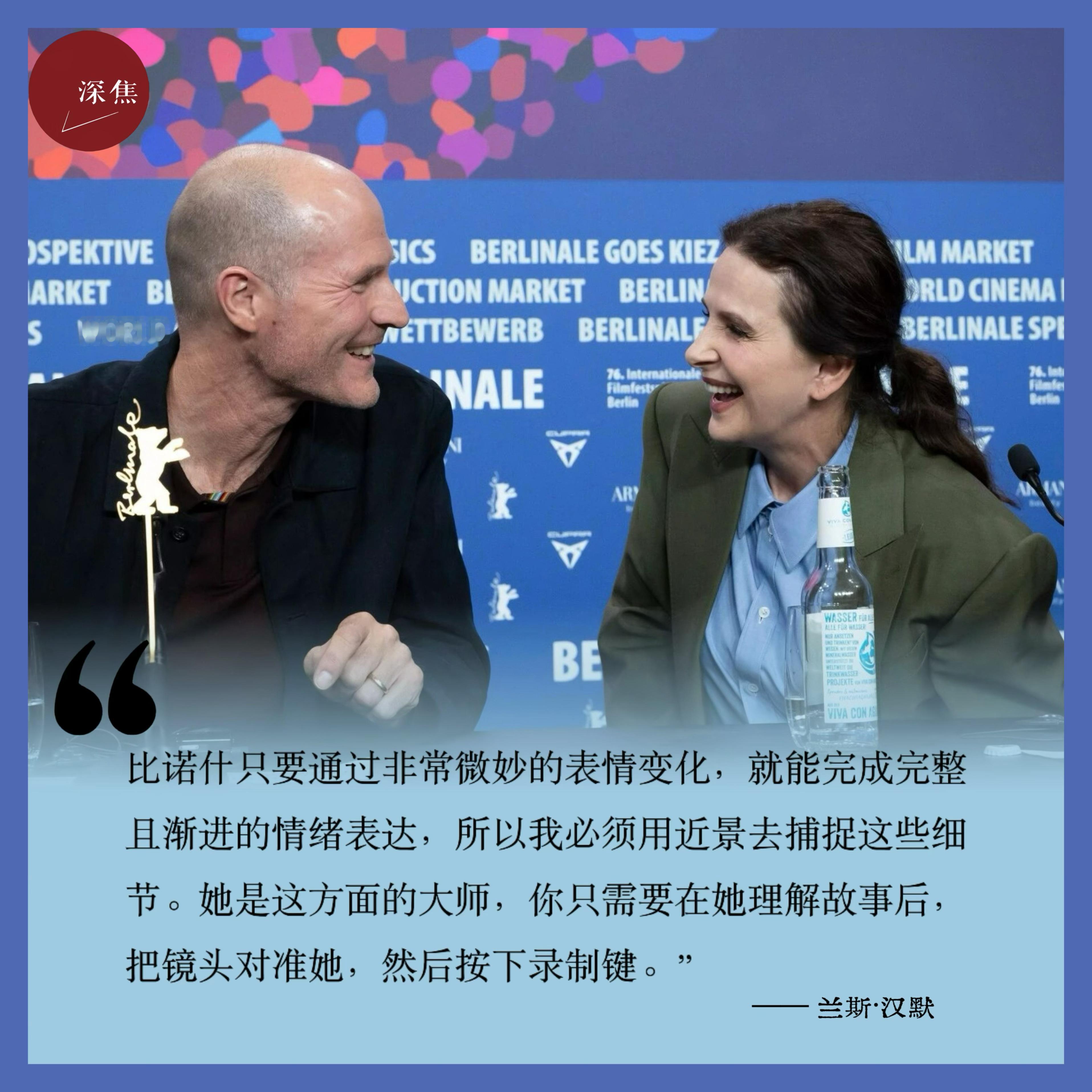 谈到朱丽叶·比诺什的表演,他盛赞她是“微相学大师”:只需非常微妙的表情变化,就能完成完整且渐进的情绪表达。他要做的,只是在比诺什理解故事后,把镜头对准她,按下录制键。