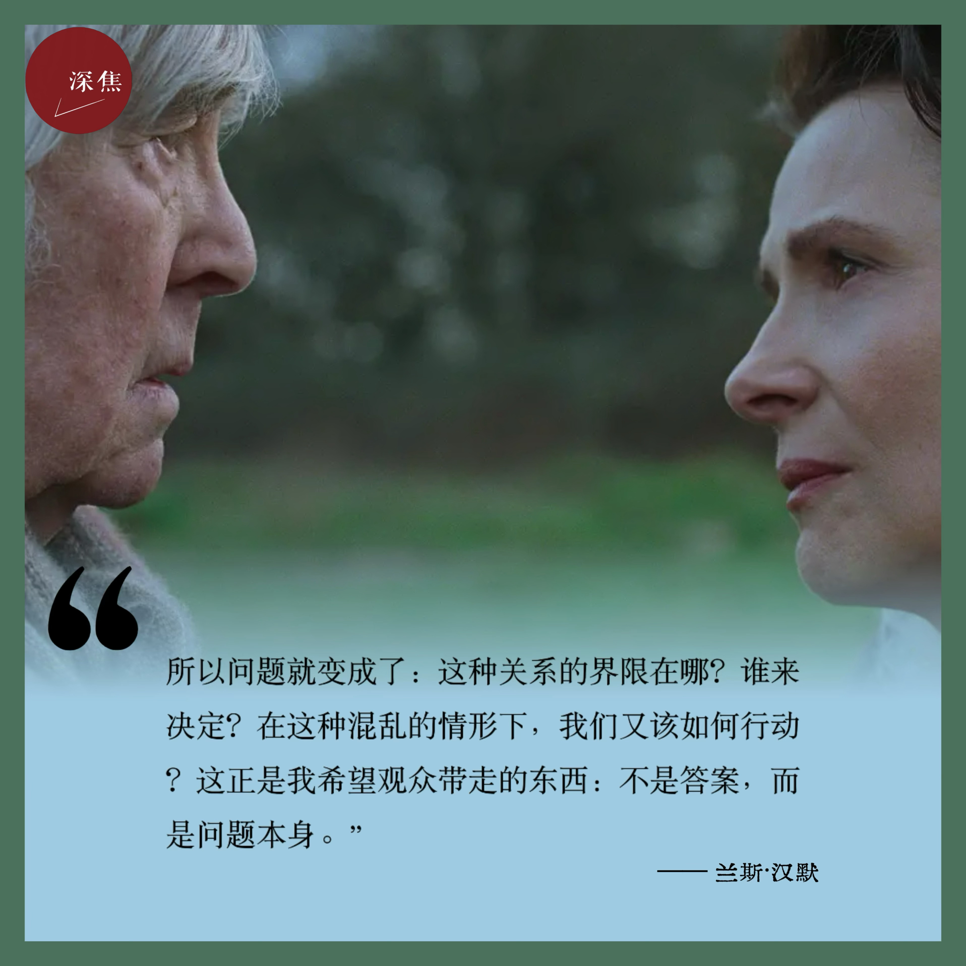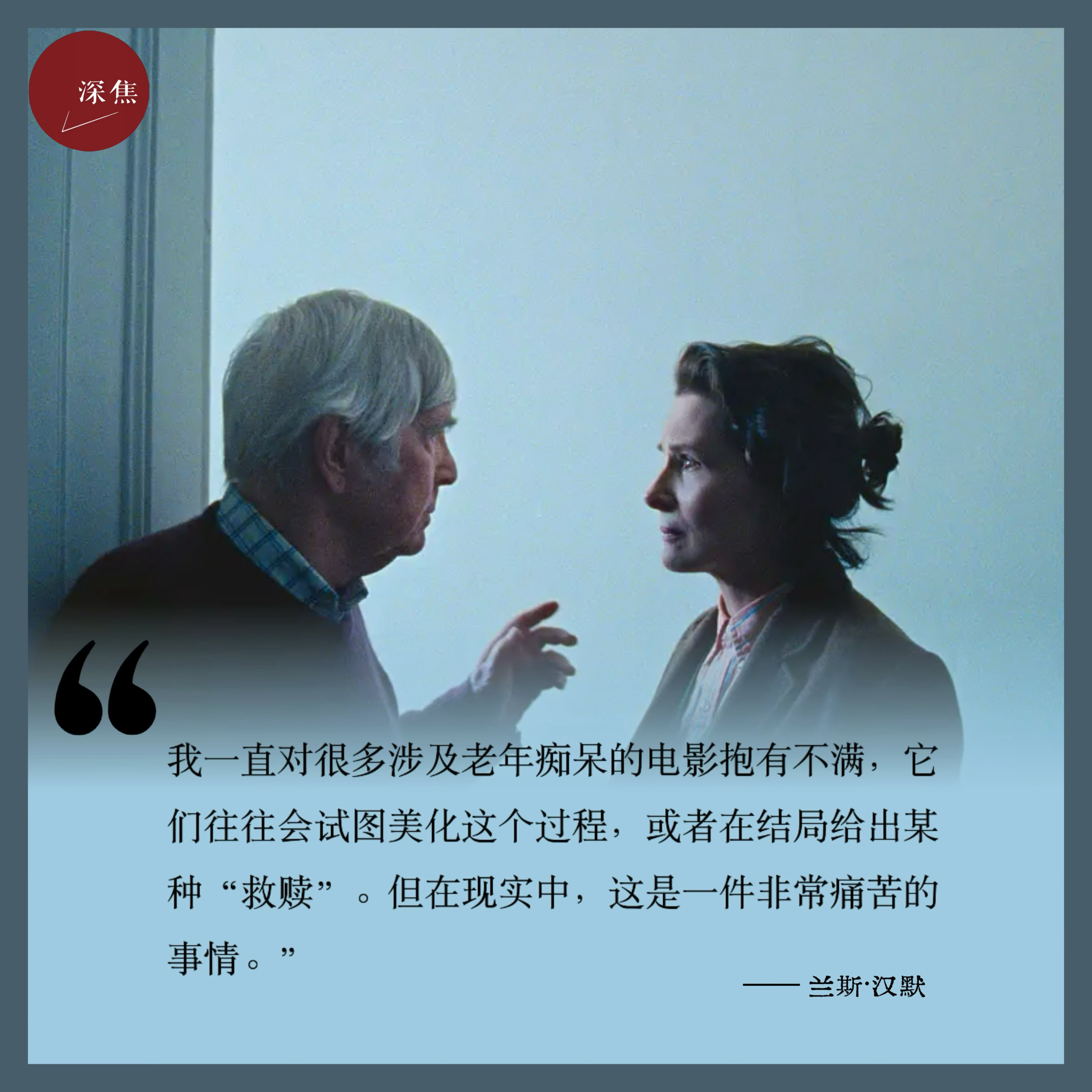 触动的是他对阿尔茨海默症题材的态度。接触大量痴呆故事后,伦理困境对他冲击极大。一天在厨房,一个下午理出全片框架。起初无意拍这个议题,但念头挥之不去,剧本写完,他便决定拍。谈到很多同类电影,他直言不满:“它们往往试图美化这个过程,或者在结局给出某种“救赎”。但在现实中,这是一件非常痛苦的事情。”